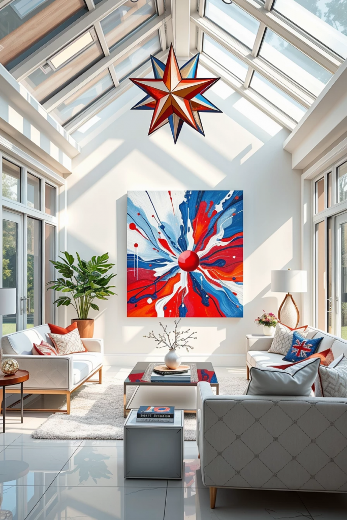 Foster an environment of elegance with the addition of modern art installations. Picture a large abstract painting in red, white, and blue, or a sculptural installation featuring stylized stars. As long as the work of art is contemporary and abstract, it will avoid cliche while still paying tribute to the holiday. In your sunroom, soft, directed lighting can be used to draw attention to the art, creating a gallery-like atmosphere.