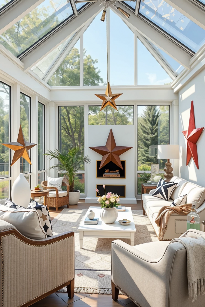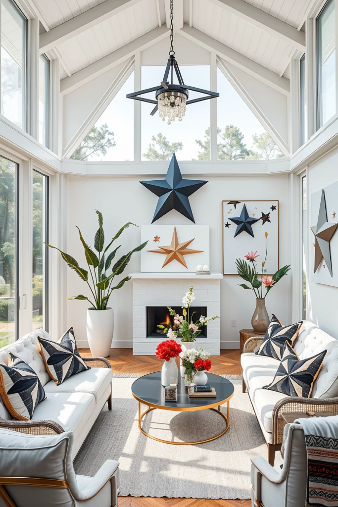 Update the traditional star design to fit a more modern theme while keeping it elegant. Go for minimalist star sculptures, geometric star-patterned cushions, or soft white and brushed gold star-shaped wall decor. These stars in neutral tones like matte black or ivory create a sunroom suited for a high-end celebration on July 4th. A modern approach with minimalistic details guarantees a professional look instead of coming off as cheesy.