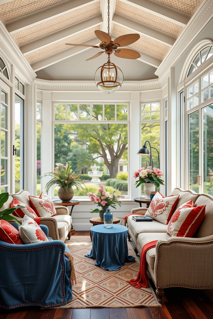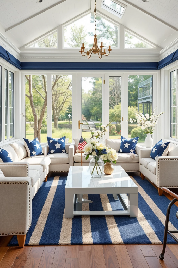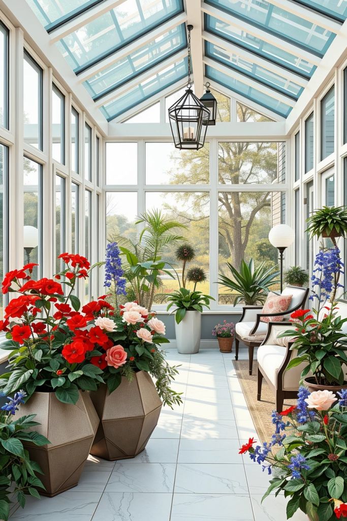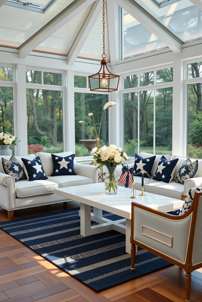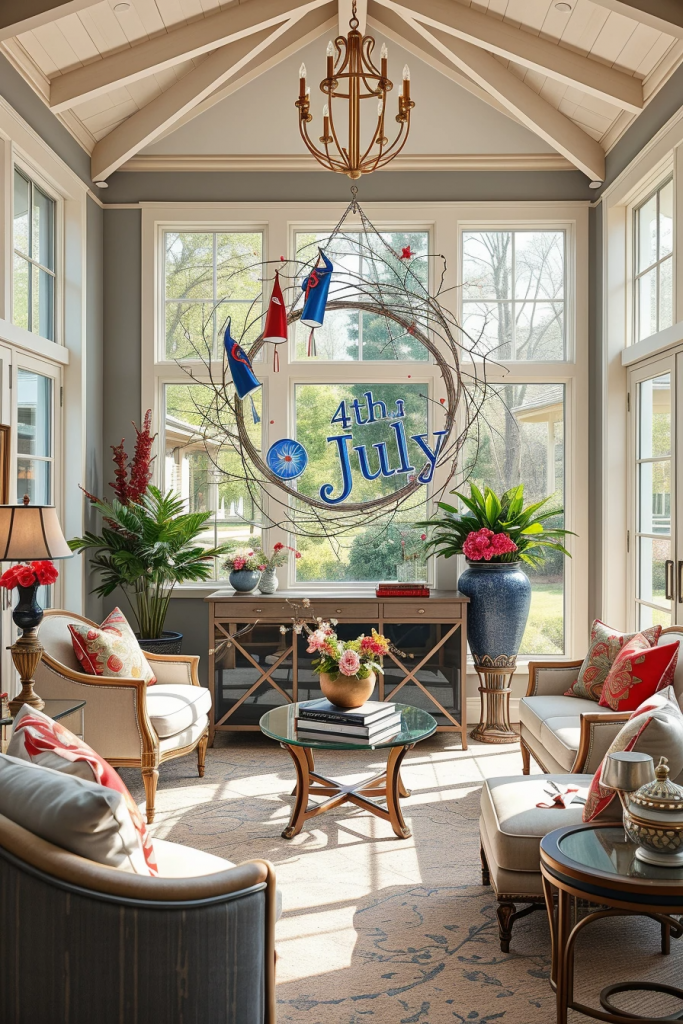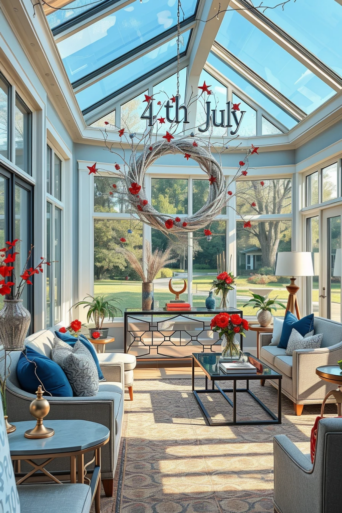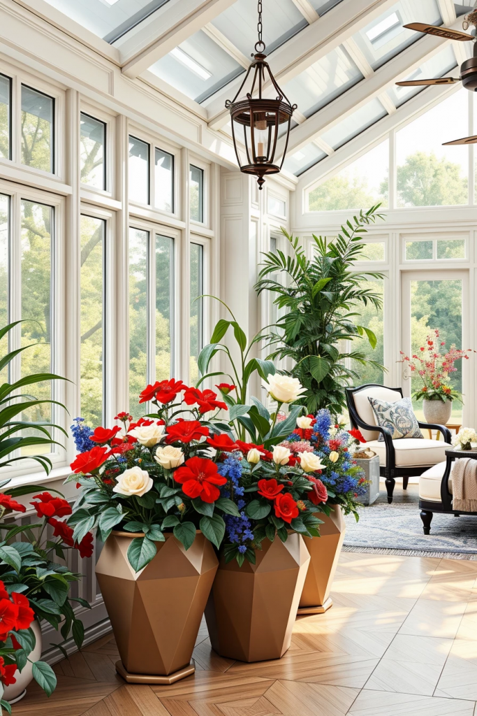 Add some architectural splendor to your 4th of July sunroom using striking sculptural planters filled with flowers blooming in patriotic colors. Select large geometric planters made of concrete or ceramic and fill them with red geraniums, white roses, and blue salvia. Position the planters so that they form natural divisions in the room or highlight key furniture arrangements. This strategy achieves the dual purpose of adding greenery while reinforcing the theme.