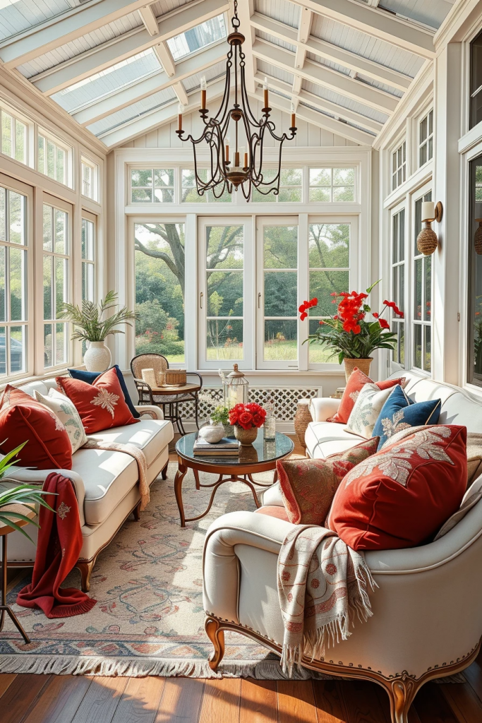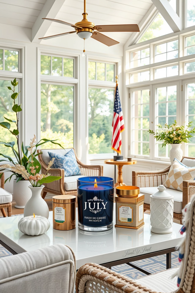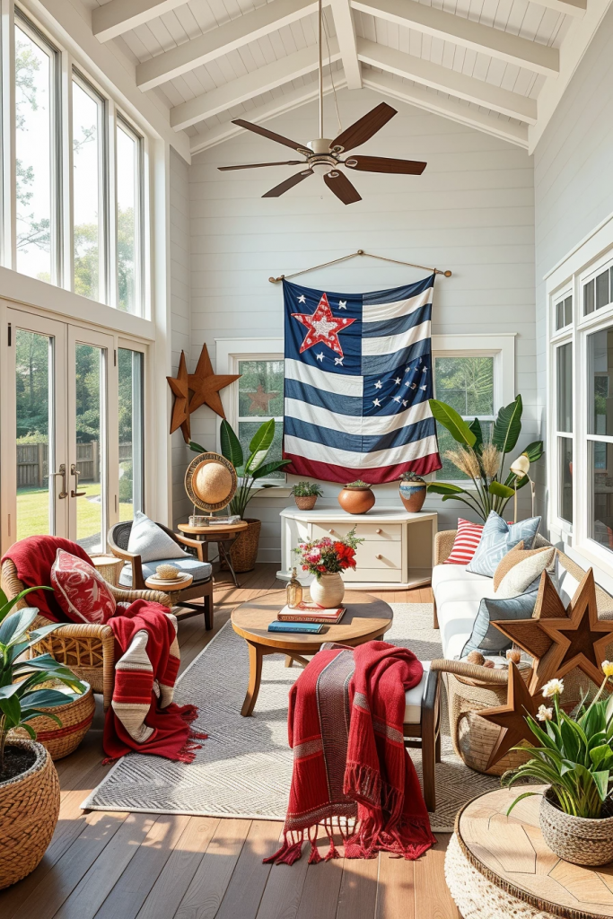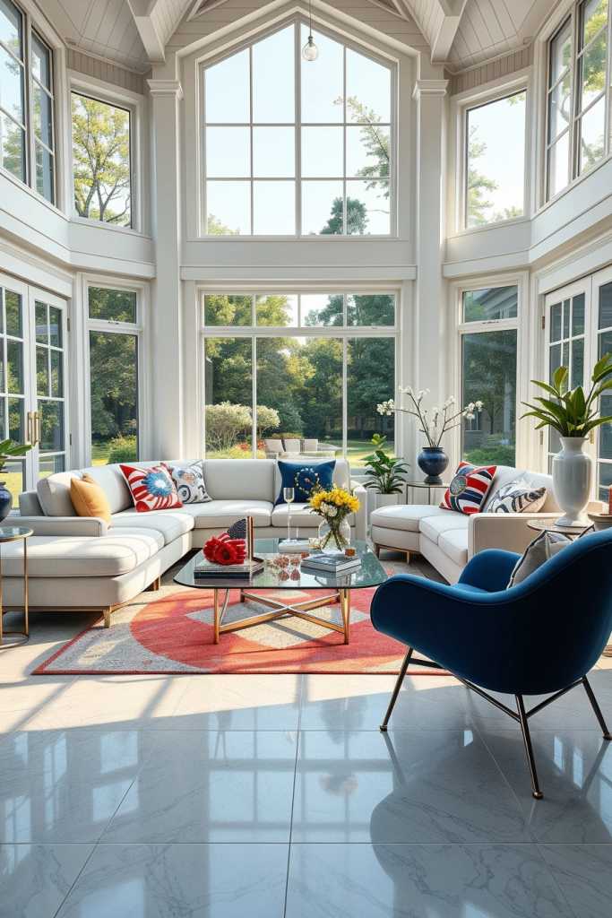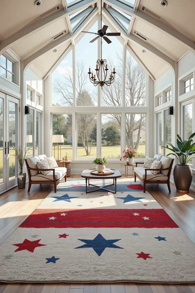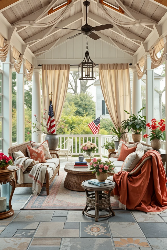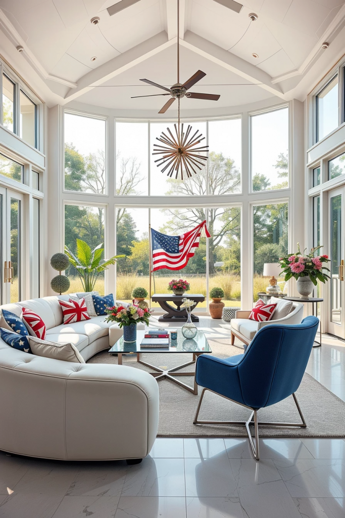 Add some architectural splendor to your 4th of July sunroom using striking sculptural planters filled with flowers blooming in patriotic colors. Select large geometric planters made of concrete or ceramic and fill them with red geraniums, white roses, and blue salvia. Position the planters so that they form natural divisions in the room or highlight key furniture arrangements. This strategy achieves the dual purpose of adding greenery while reinforcing the theme.