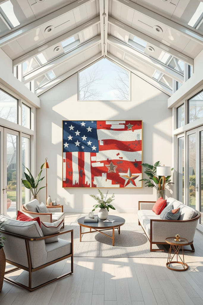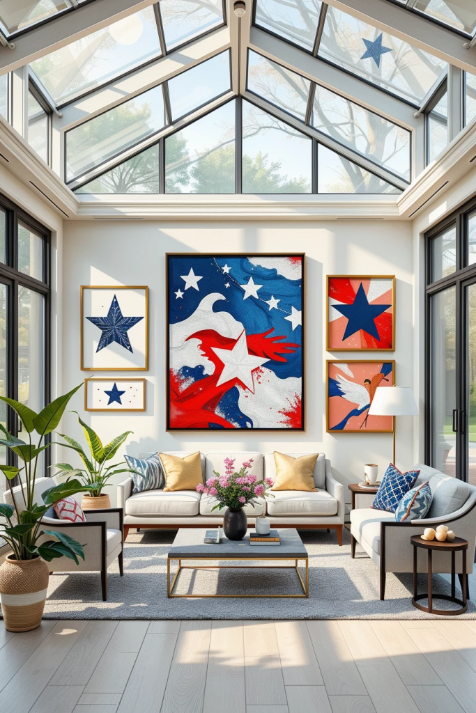 Design a sunroom gallery with custom 4th of July art displays. Pick contemporary patriotic art such as abstract representations of the flag, starry designs, and red, white, and blue minimalist paintings. They should be framed in black or gold to match. Art pieces should be strategically placed on one wall or arranged in salon style instead, paying attention to art placement increases the elegance of the holiday setting.