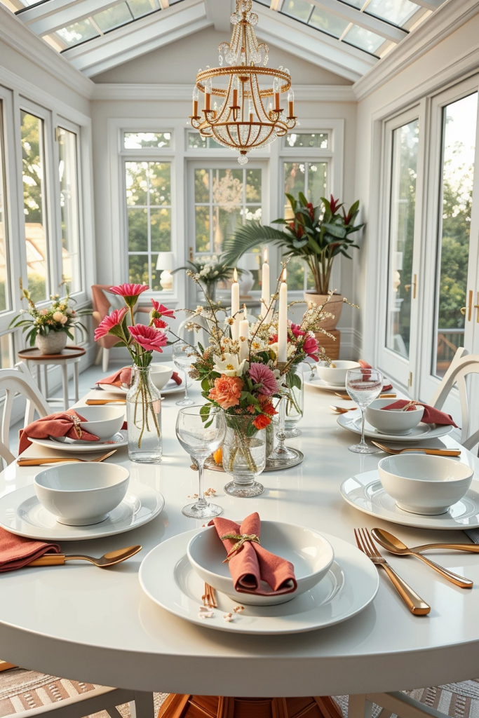 A tablescape brings your 4th of July sunroom ideas to realization in an effortlessly sophisticated way. Incorporate sleek metal flatware in addition to modern white ceramic dinner plates, and use linen napkins in muted red or navy colors. Furthermore, clear glass vases filled with small flowers enhance the overall aesthetic. Slim taper candles placed in metallic holders also add to the design. A geometric sculpture or delicate floral centerpiece helps enhance and deepen the streamlined feel.