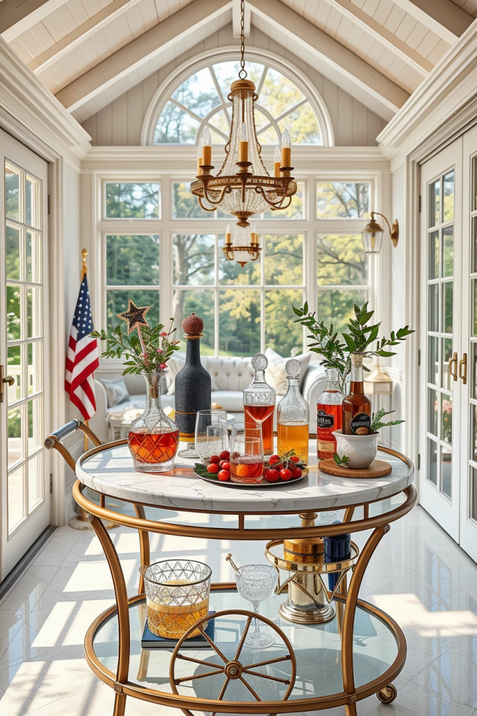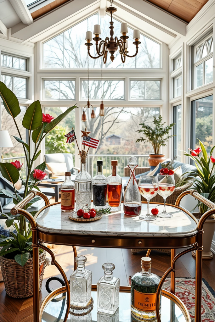 A custom drinks cart makes any 4th of July weekend sunroom party a whole lot fancier. Arrange a slim marble-topped bar cart or simple sideboard and add a few artistic wine bottles, cut-glass decanters full of wine, and stylish patriot-themed drink accessories including star clip drink stirrers. Place a small bowl of red cherries alongside sprigs of herbs to add holiday spirit in a discreet and classy way.