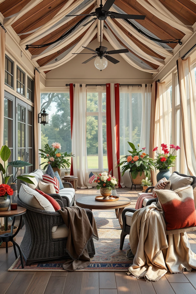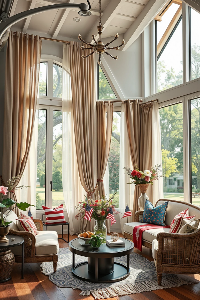 Border the sunroom windows with elegant drapery that matches the style of your 4th of July decor. For such cordial occasions, go for soft hues such as off-white, light blue, or soft red, and use luxurious sheer linen silk blend fabrics. Sleek metal or wood curtain rods can be used for a clean architectural style. Sheer panels combined with blackout curtains enhance the design and help control the summer sun.