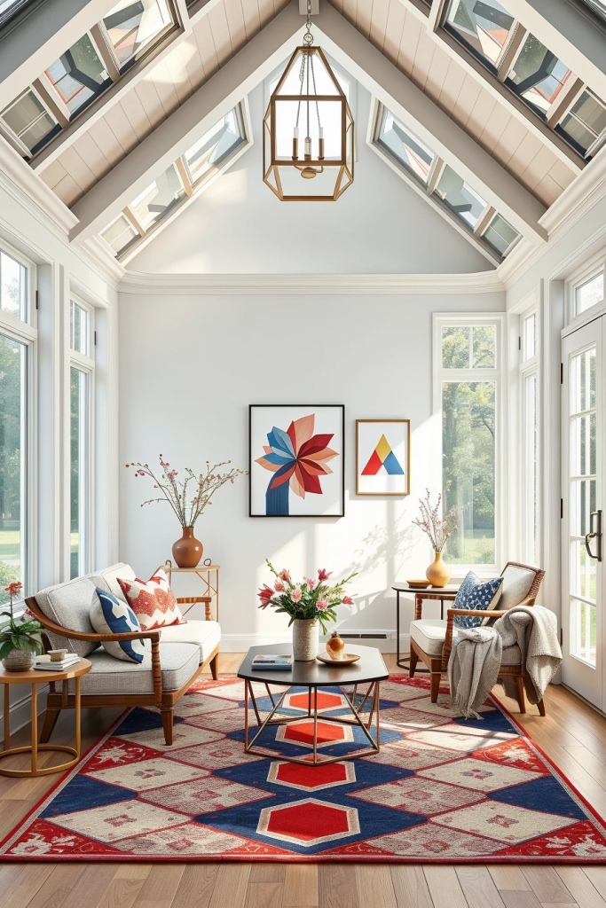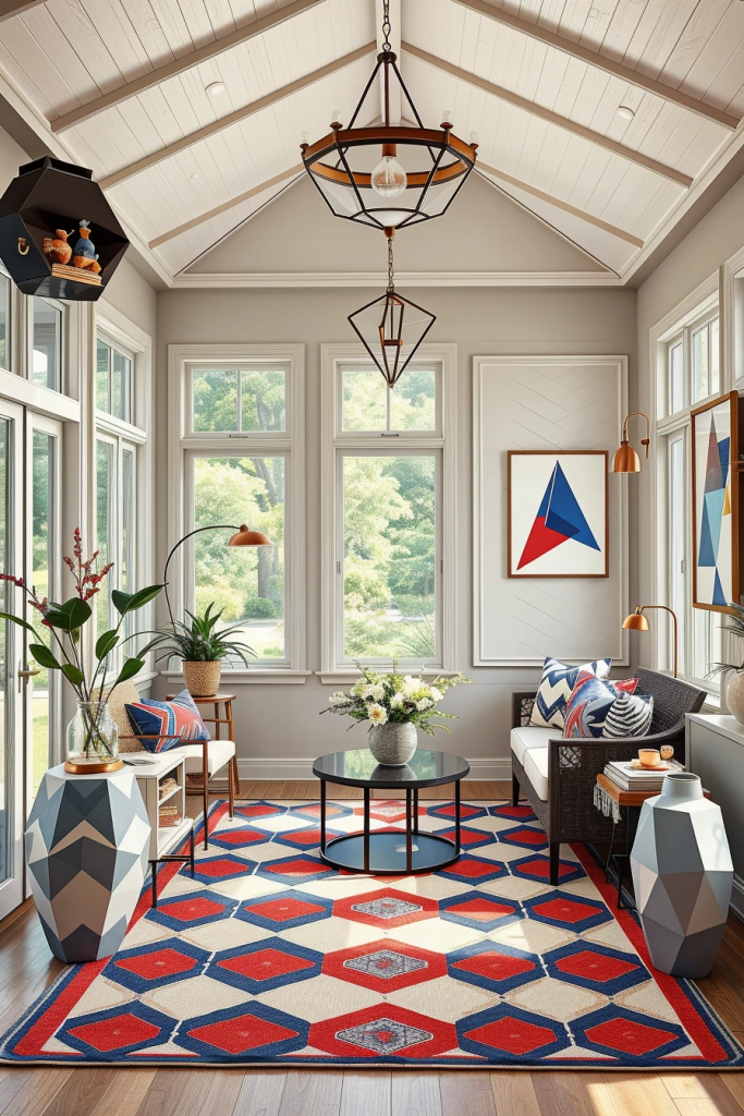 Add a contemporary geometric touch to your sunroom decor to give it an inspired polish. Use shelving units with hexagon shapes, prominent area rugs in the colors navy, crimson, and ivory featuring geometric patterns, and triangular light fixtures. Polygonal vases set on tables or triangular wall art can serve as small finishing touches that bring all the elements together. Every discerning host will appreciate the attention to detail, combining art and fashion for ingenious seasonal display.