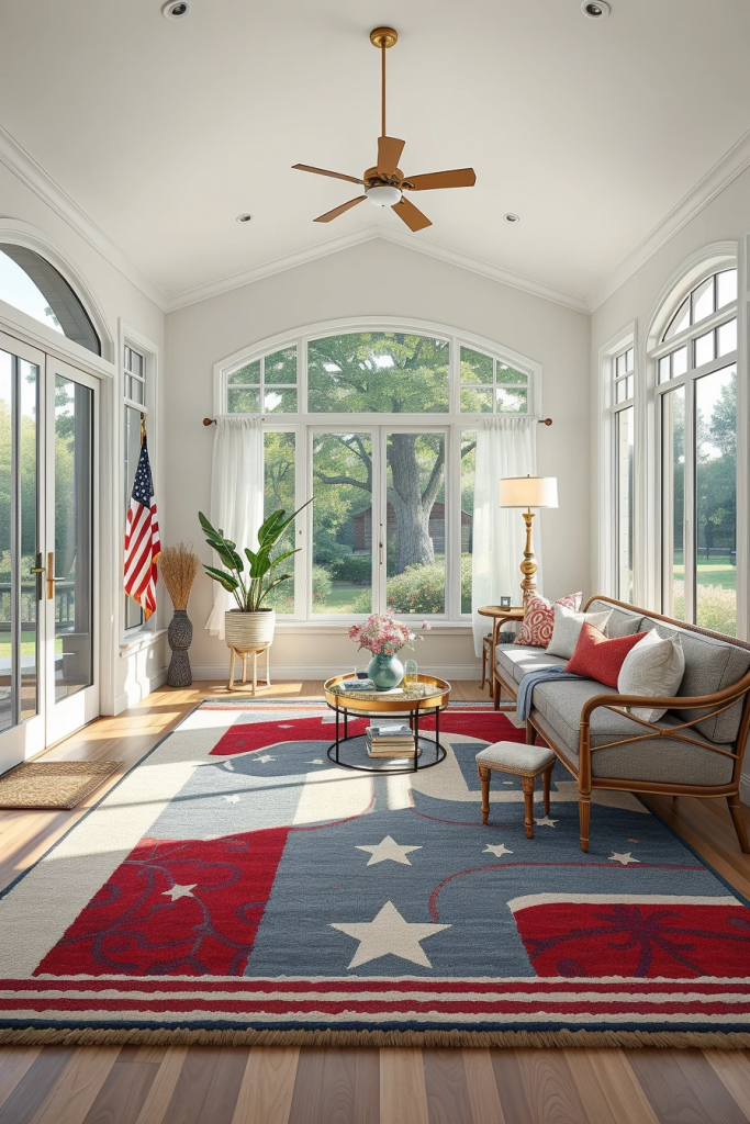 A custom designed rug can serve as a centerpiece, of simple charm, to your 4th of July themed sunroom. Look for one that displays delightful swirling patterns of starts with figurations of both stripes, capturing a subdued navy, white, and dusty red. Choose a textured blend of wool and silk, or other natural fibers, boasting a touch of opulence. The right rug celebrating Patriotism in a subtly sophisticated manner, balances the furnishing while utterly transforming the room, advancing beyond decor without drowning domination.