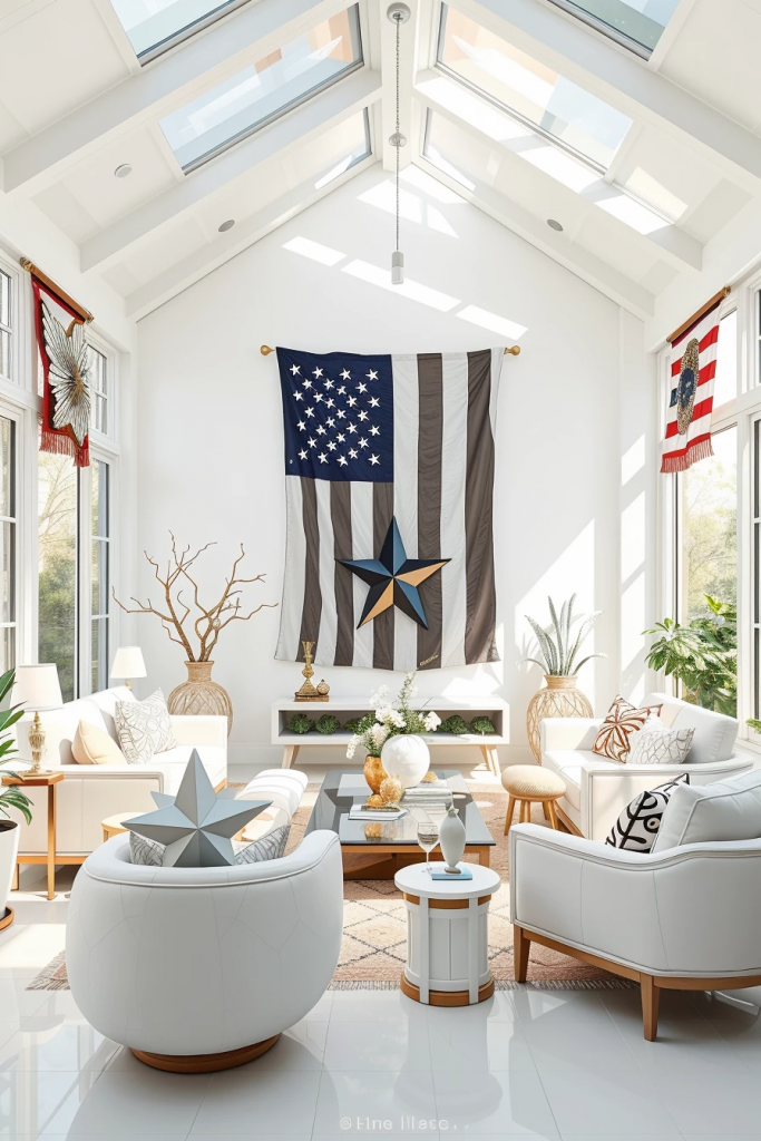 For simple lovers, a minimalist 4th of July sunroom captures the essence of understated luxury. Choose sleek, low-profile furniture in white or soft beige. In addition to monochrome patriotic banners, minimalistic star-shaped sculptures could also be used to decorate the room. Instead of clutter, statement artworks featuring oversized flags on walls can be used to make a bold statement while remaining uncluttered.