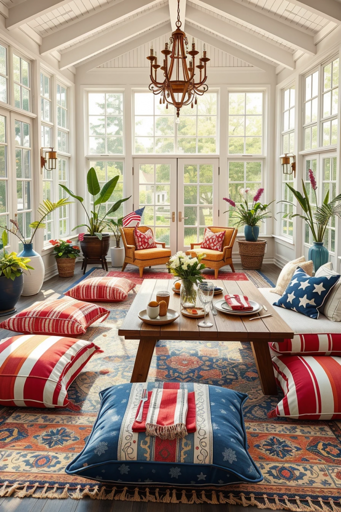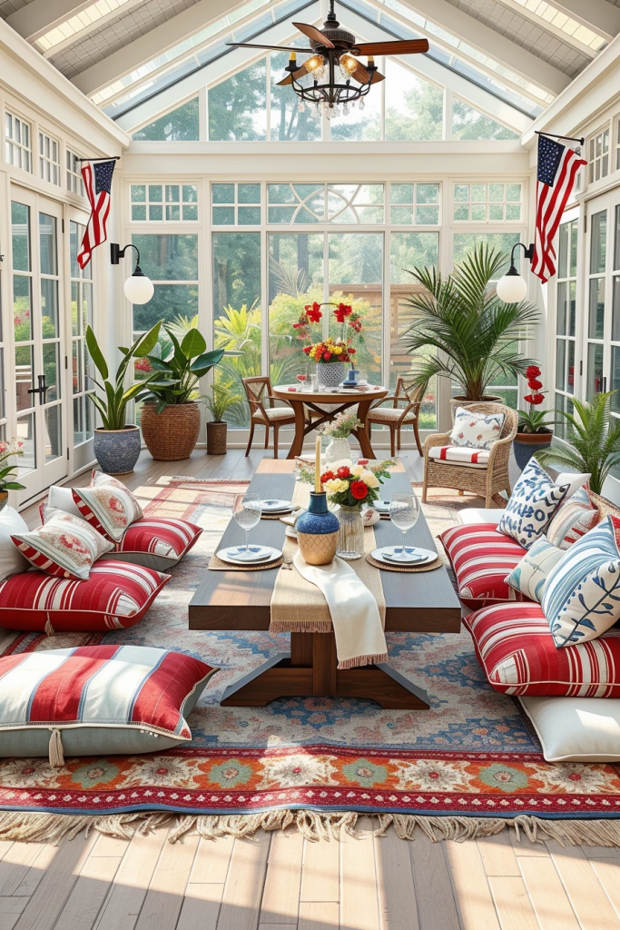 Elevate your sunroom into a designer indoor picnic for the 4th of July celebration. Add an extra touch with red, white, and blue floor pillows and regionally crafted table decor on wooden tables. Striped rugs and oversized plush pillows add comfort while linen runners along with artisan crafted dishes bring elegance. Small touches, like crystal glasses and handcrafted cheese boards, help transform an amazing idea into an out of the box reality.