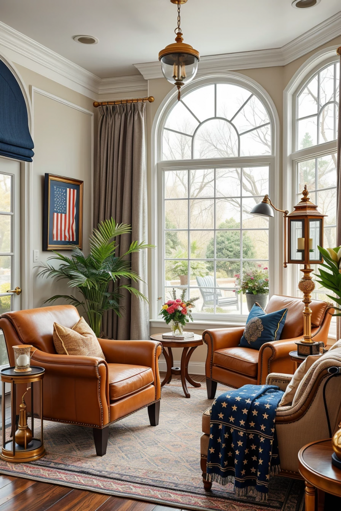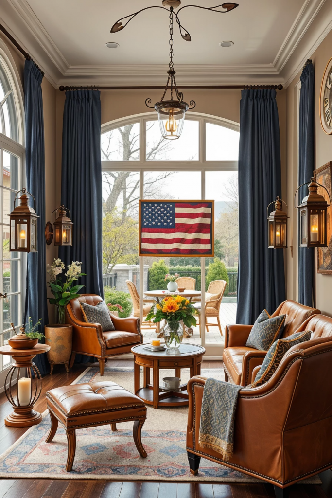 Celebrate the holiday with designer Americana in all its glory, complemented by tasteful, deliberate accents. Imagine rich camel colored leather armchairs, navy colored linen drapes, and antique brass lanterns. Flag motifs in pastel colors make for elegant art pieces—vintage American flags turned into framed paintings. A gentle hint of Americana is showcased by a throw draped over the armchair which softens the hint of nationalism.