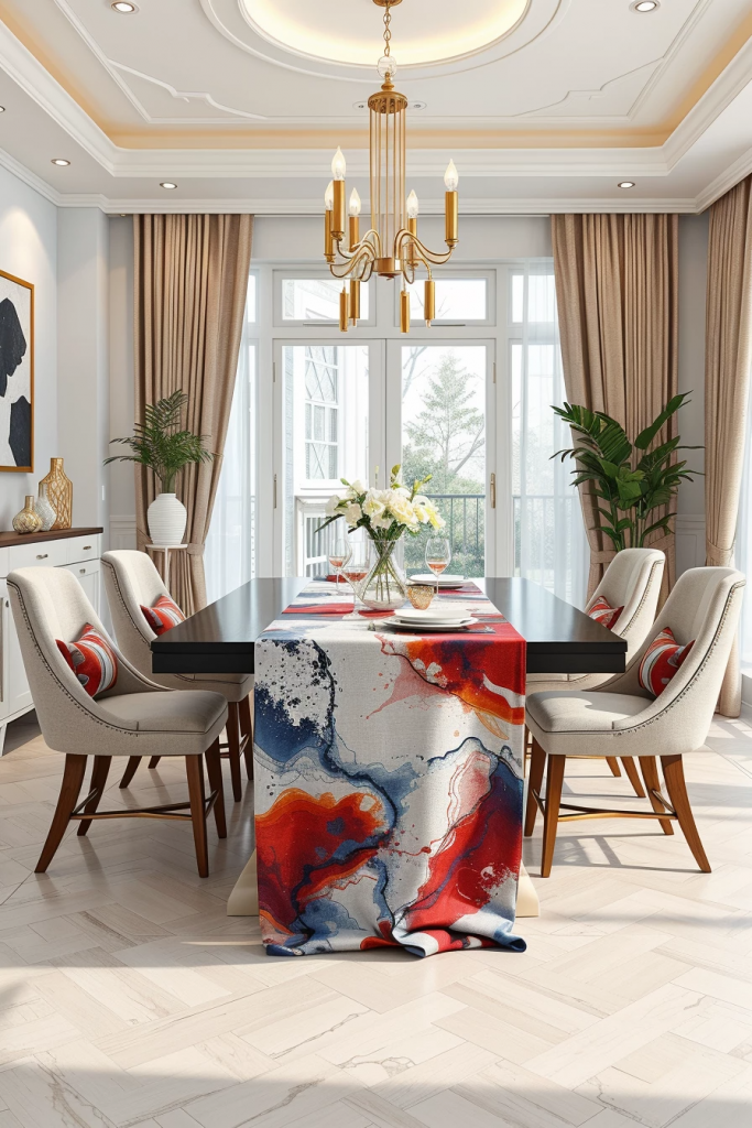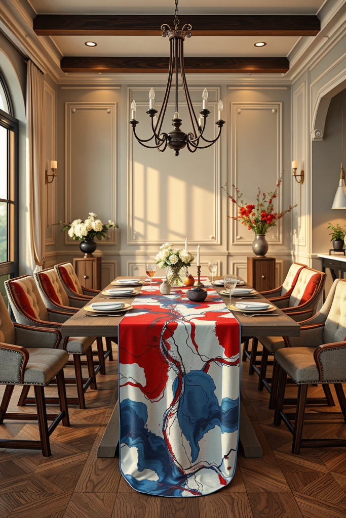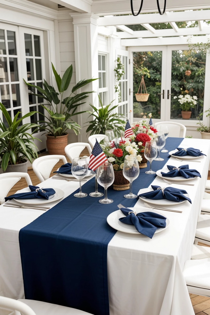 Rather than using standard flag-themed runners, you might want to try modern abstract patriotic colors with subtle stripes or soft thread work patterns. Using silk or linen adds a bit of elegance while maintaining a simple and clean design. It is a goal that can be accomplished with no effort and transforms the entire appearance of the table in a gentle and inviting manner.