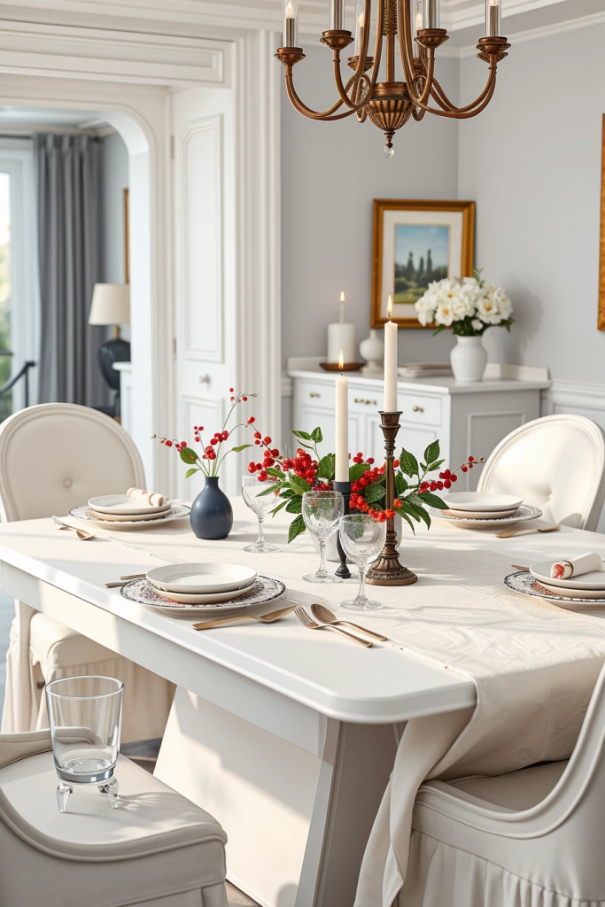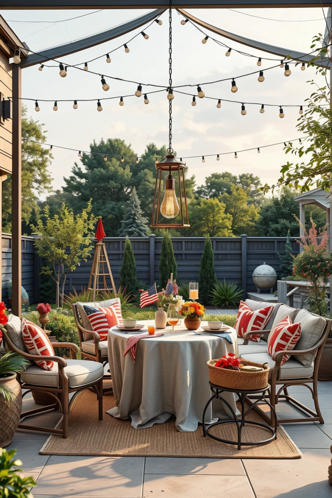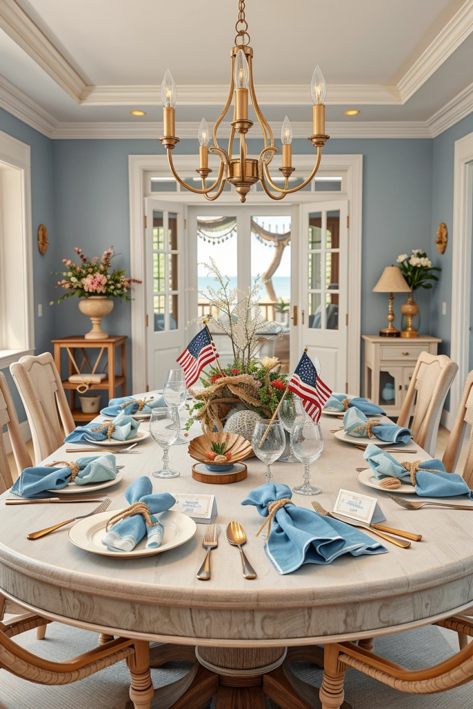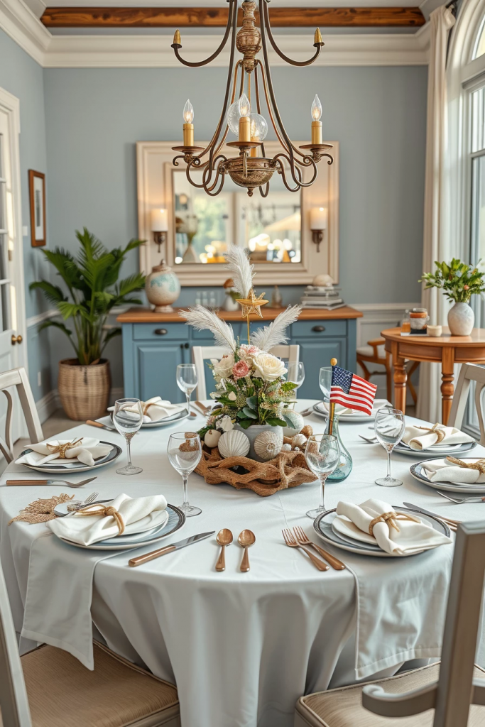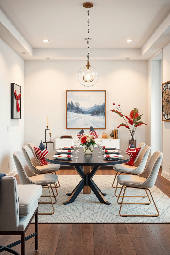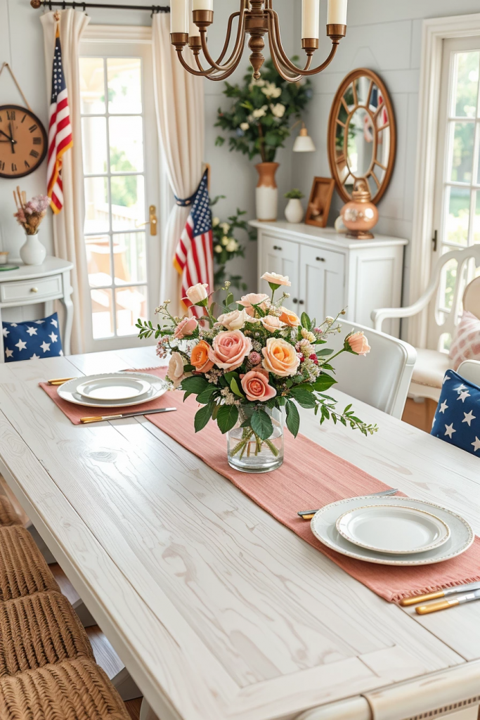 To achieve a simple yet festive look, you need to have understated patriotic decor. Pay attention to white surfaces and micro-accents such as a bowl with small red berries or candles in navy blue set along a neutral colored linen runner. This refined style helps maintain 4th of July spirit while ensuring it isn’t overpowering or overwhelming anywhere else, striking the ideal balance for the setting.