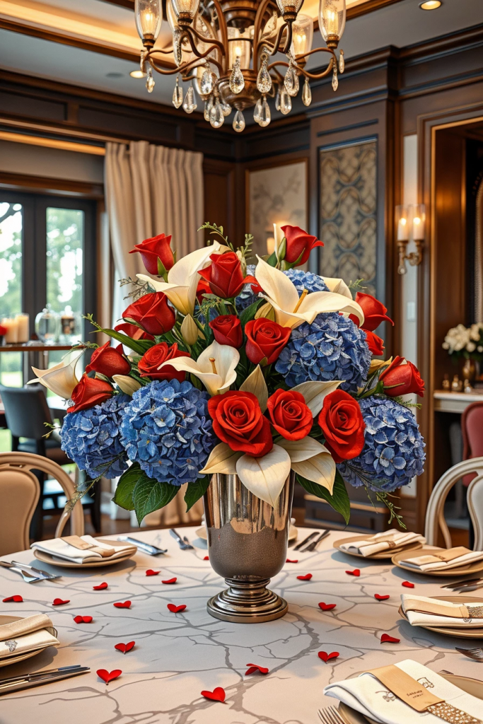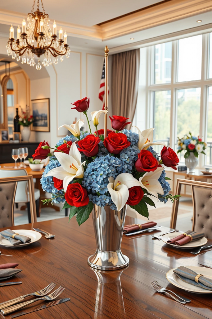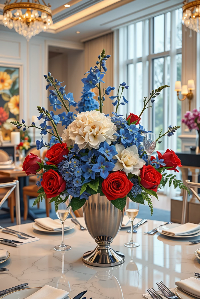 Combine sophisticated floral centerpieces with striking color blocking for a modern vase arrangement. Use deep blue hydrangeas, red roses, and white calla lilies. The flowers should flow in a symmetrical manner rather than cascading style. The contemporary look can be appreciated through the use of sleek metal vases or clear glass cylinders. This skilled arrangement gives subtle expression towards patriotic sentiments without falling into cliches.