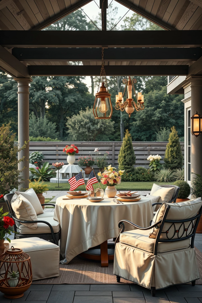 Even outdoor dining while celebrating the 4th of July can be just as elaborate as indoor dining. A sophisticated and modern patio outfitted with neutral color cushions will do perfectly. Add strolling soft light from pendant lanterns while you place a table cloth on your table. You can set dinnerware using cushions and small centerpieces. Feel free to add some understated patriotic accents. The surrounding natural beauty along with deep and sophisticated designs will help in setting the ambiance.