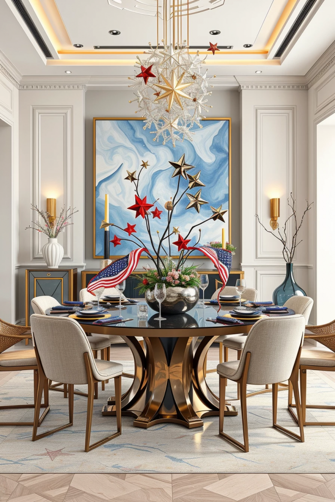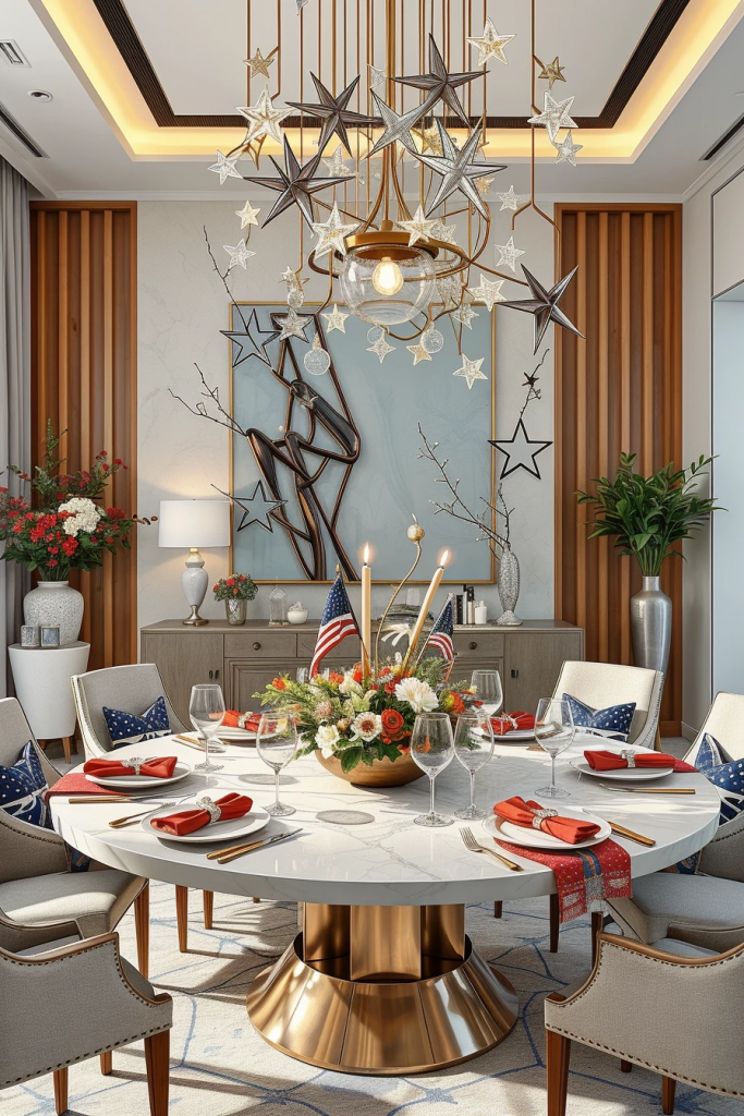 Sculptural centerpieces bring an artistic touch to modern table designs for the 4th of July. Consider modern glass sculptures, abstract metal pieces, or even minimalist star-shaped sculptures in place of traditional flowers. Having the centerpiece bold yet low-profile creates a dramatic effect without blocking the view, allowing space for movement while the table appears connected.