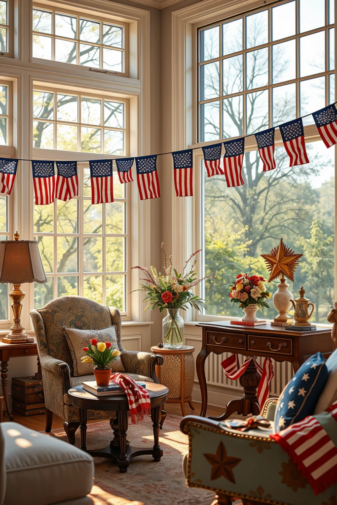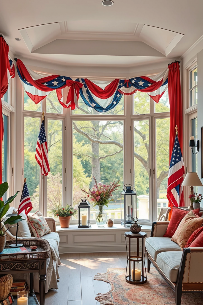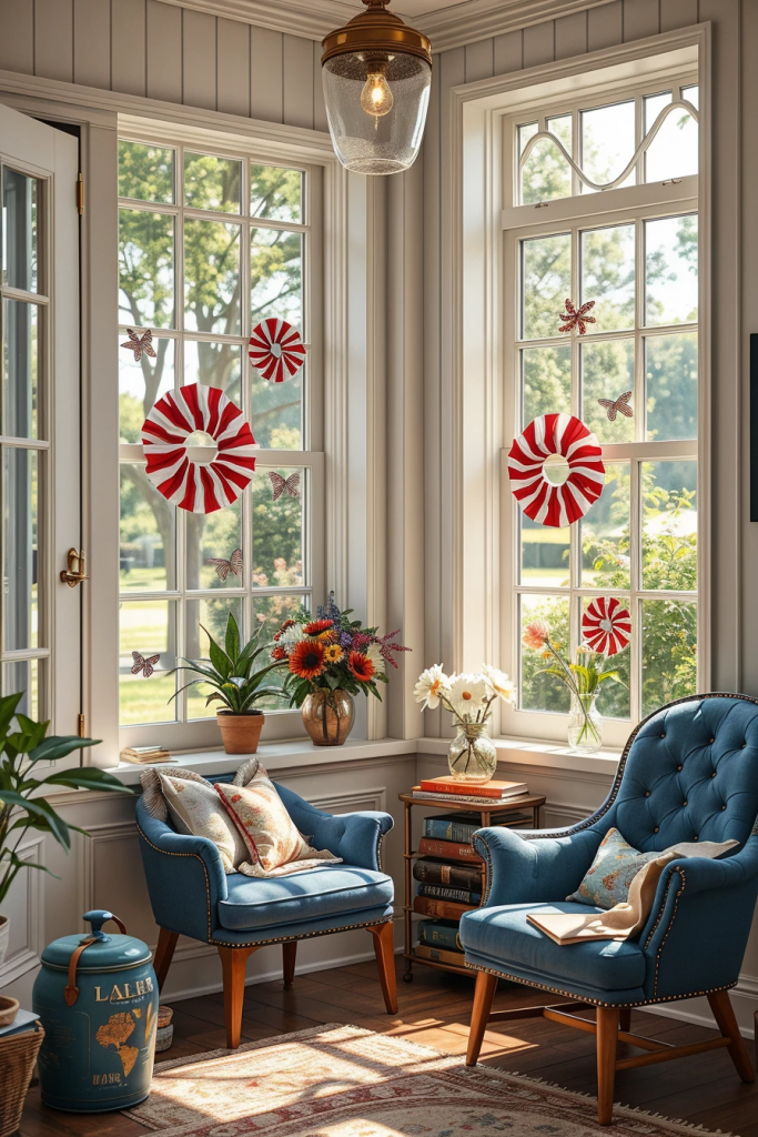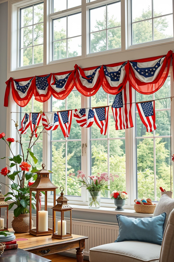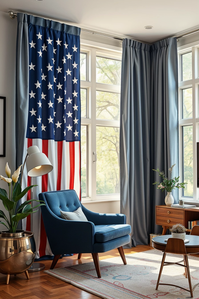 American flag-themed window decorations have always been a classic favorite American choice. These decorations can include a burst flag as a curtain to cover the window, or flag bunting can be used to decorate the window. For balance and design, a navy or crimson accent chair can be placed beside the window, which makes the room feel neater rather than too congested.