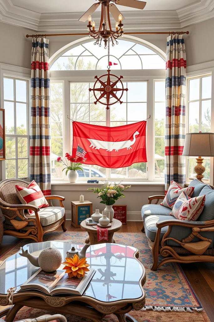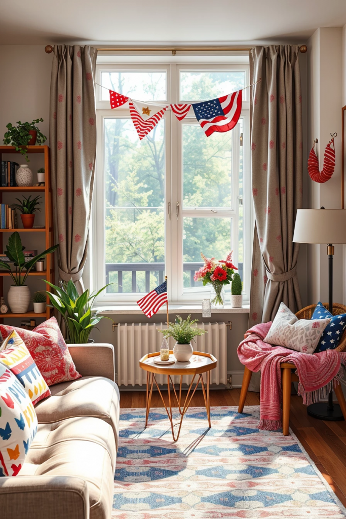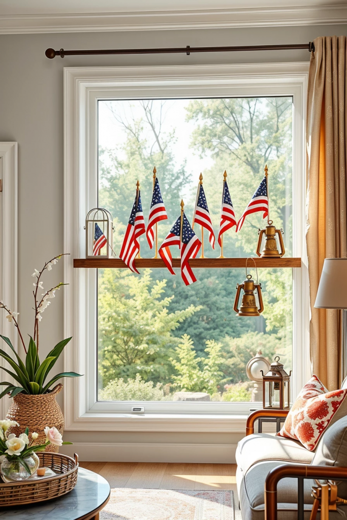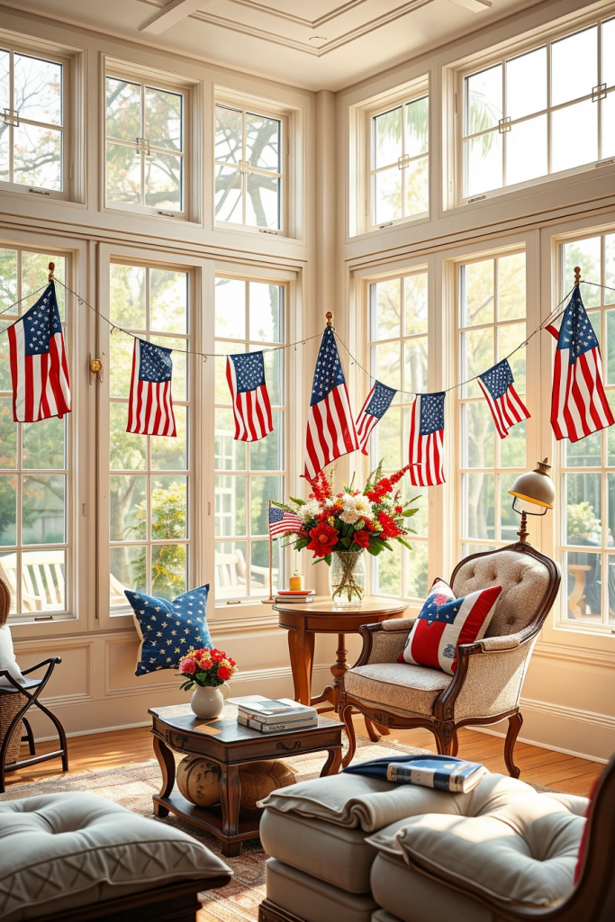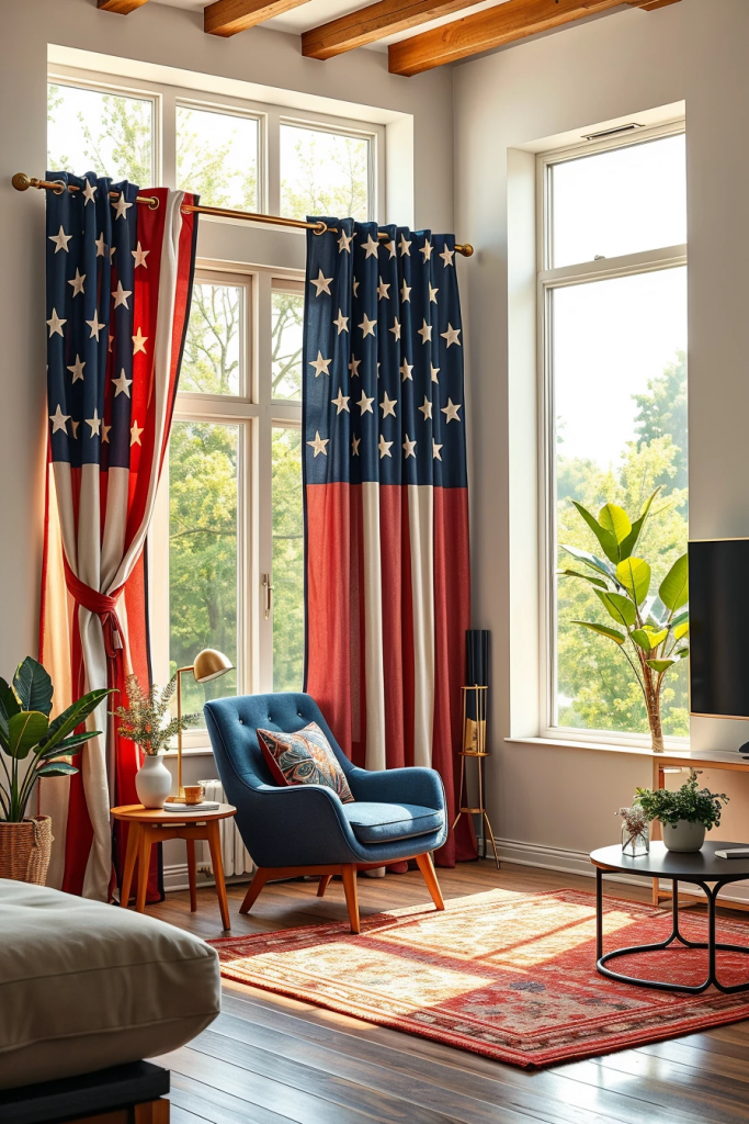 American flag-themed window decorations have always been a classic favorite American choice. These decorations can include a burst flag as a curtain to cover the window, or flag bunting can be used to decorate the window. For balance and design, a navy or crimson accent chair can be placed beside the window, which makes the room feel neater rather than too congested.