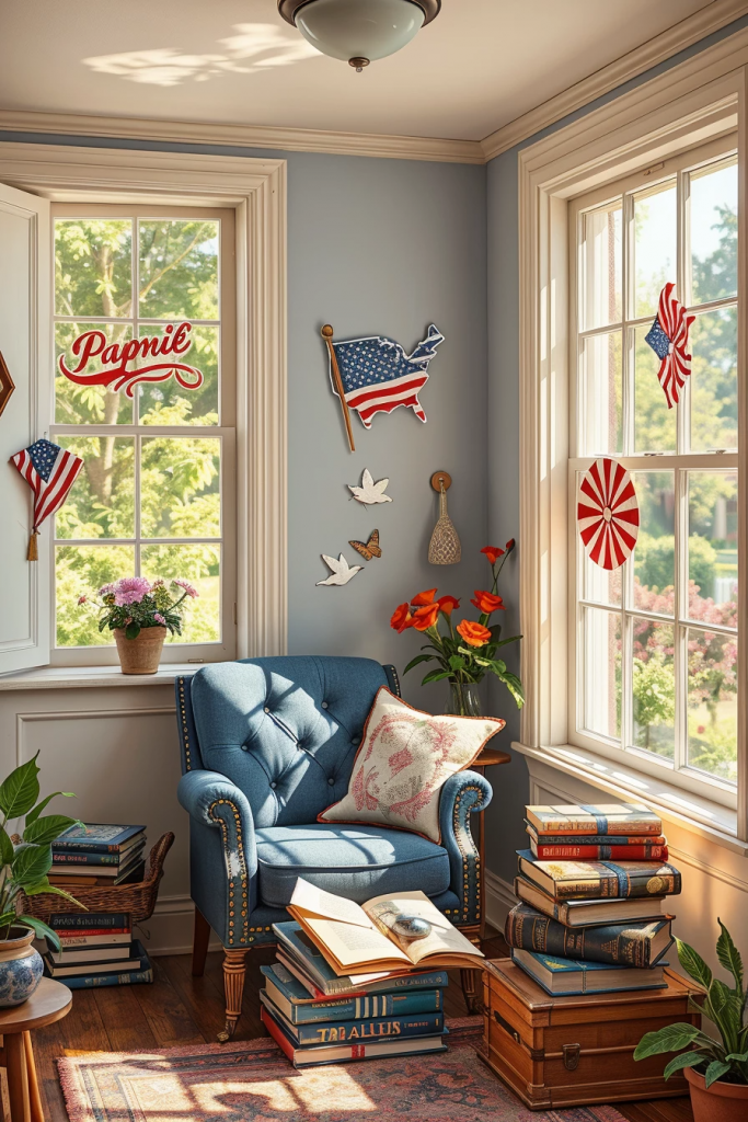 A lovely way of decorating windows in a patriotic style doesn’t have to be expensive. You can use colorful paper and cut out shapes of stars, eagles, and liberty bells. After that, you just tape them to the inside of the window. Moreover, you can turn the design into a cozy reading nook by adding an old navy blue armchair and vintage American literature. The result will surely be a mix of nostalgic and modern vibes.