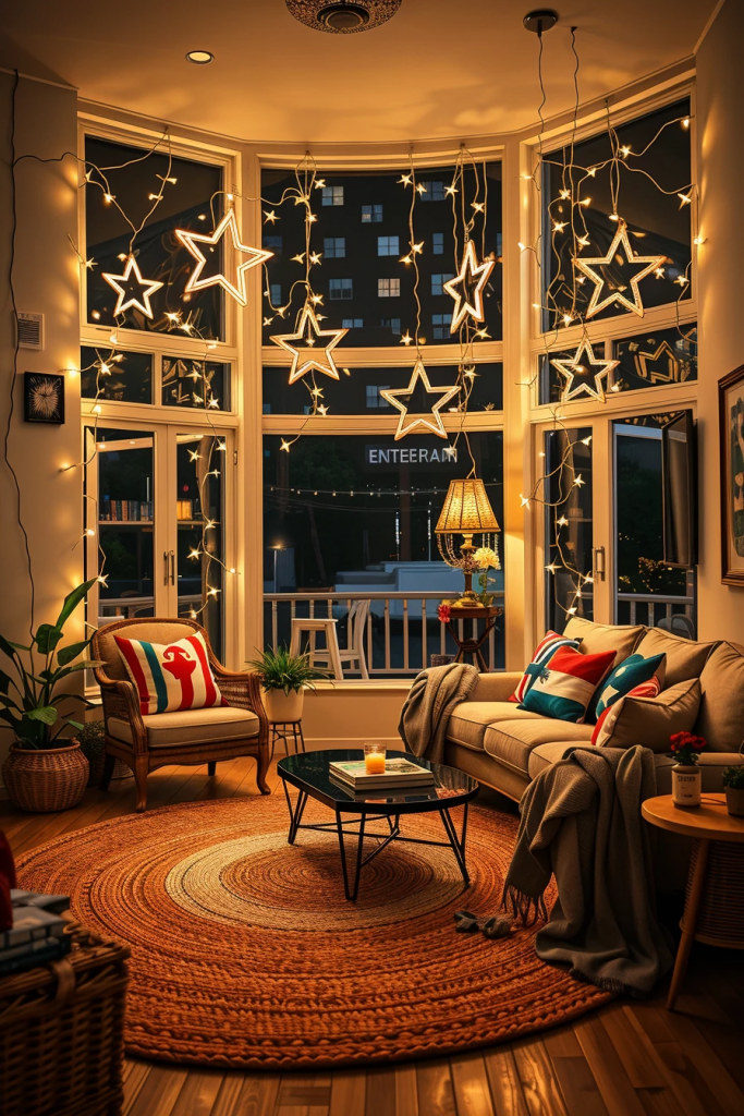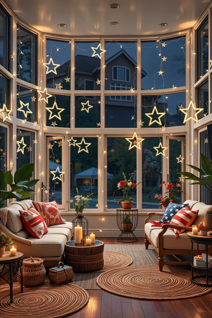 One of the best July 4th ideas for a window is to add fairy lights as they are so beautiful. They can be used in a variety of shapes like star and firework shapes and can also be wrapped around the window frame to get a new and dynamic effect. Make the area cozier with stools or small chairs covered with bright and beautiful pillows and light rugs which will add to the comfort of the area .