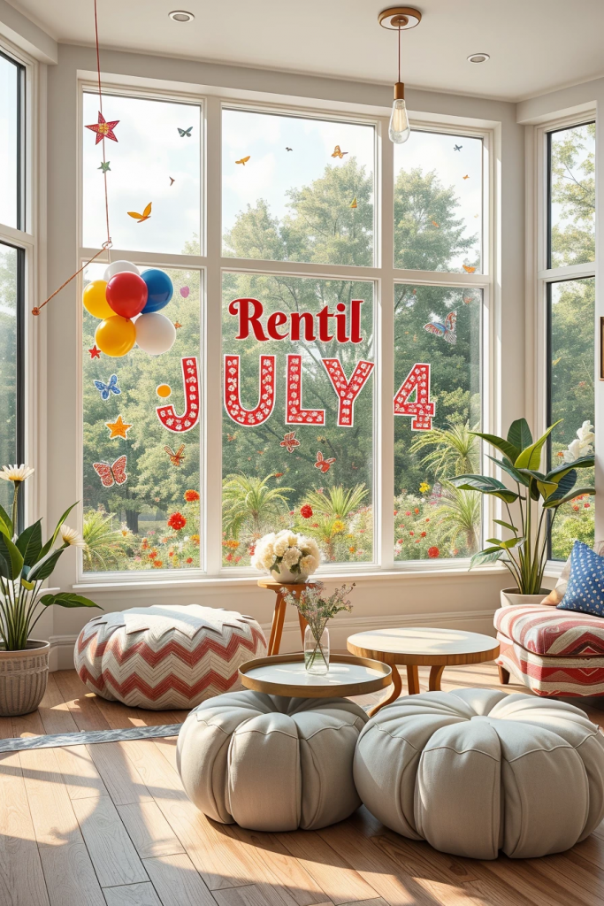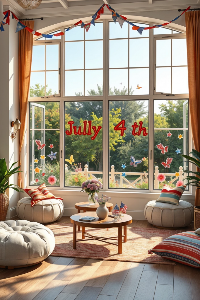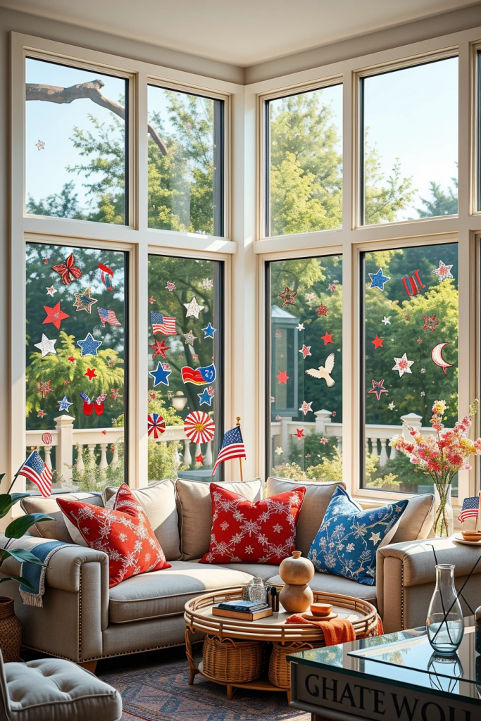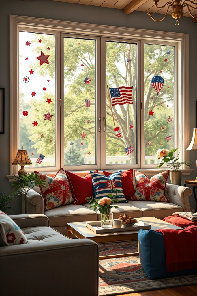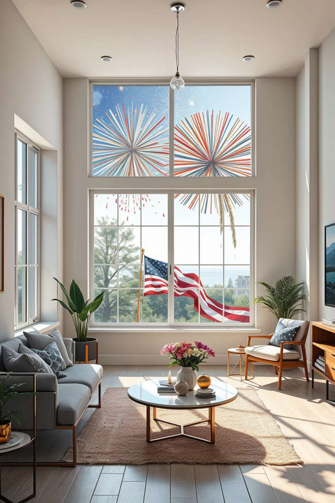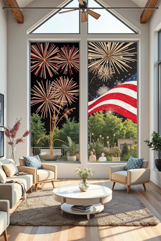 Engage children by helping them create festive 4th of July window decorations. Cheerful window displays can easily be made with colorful cutouts, stickers, and window markers which will add splendor and joy to any patriotic setup. The window art can be framed with a playful family room arrangement like beanbags, crafting tables, and bright rugs and thus transform the room into a family friendly holiday wonderland.