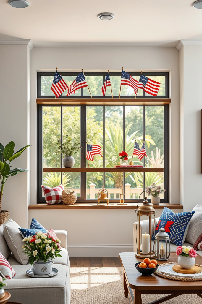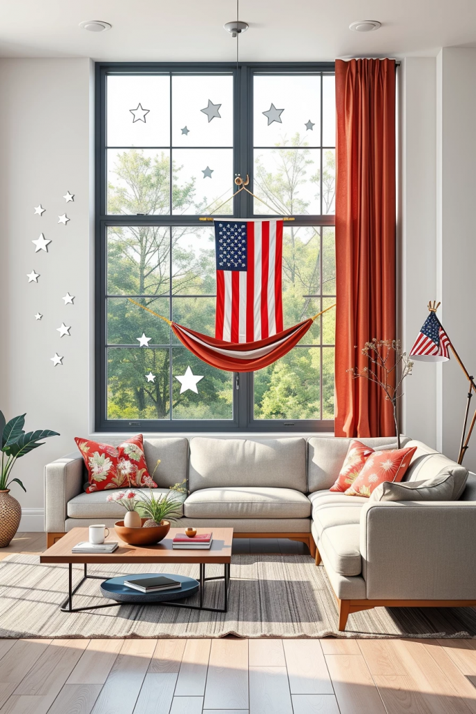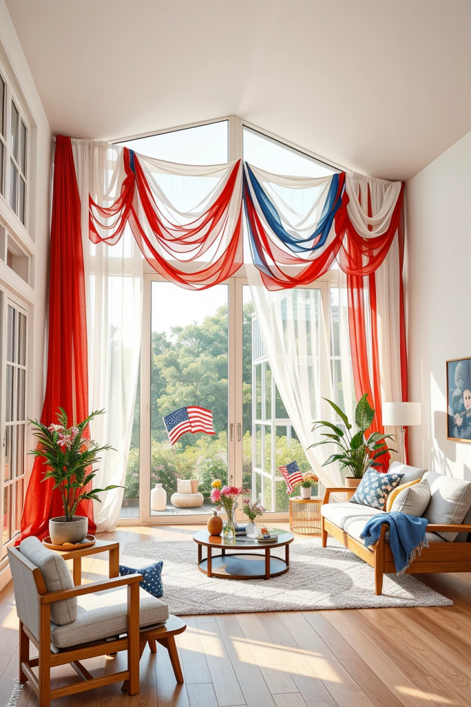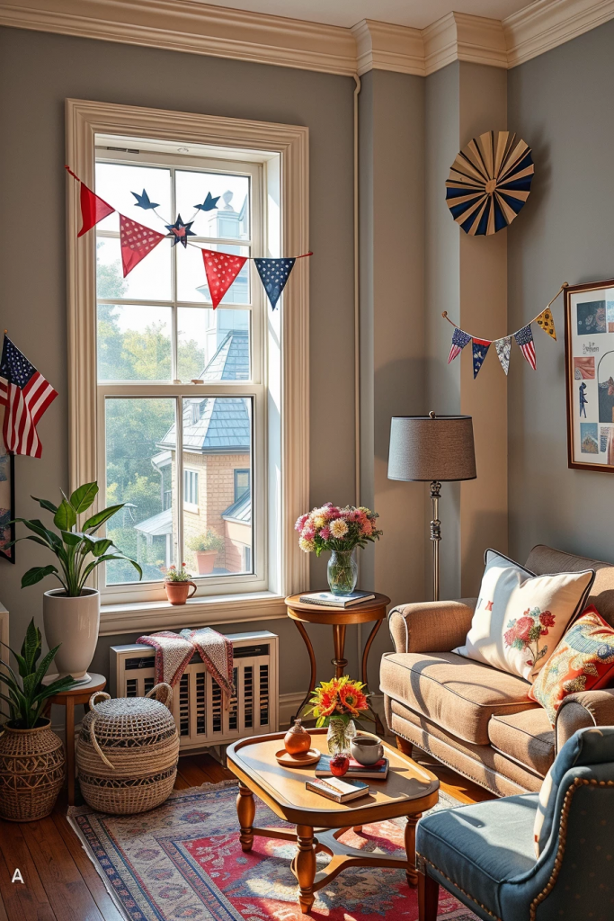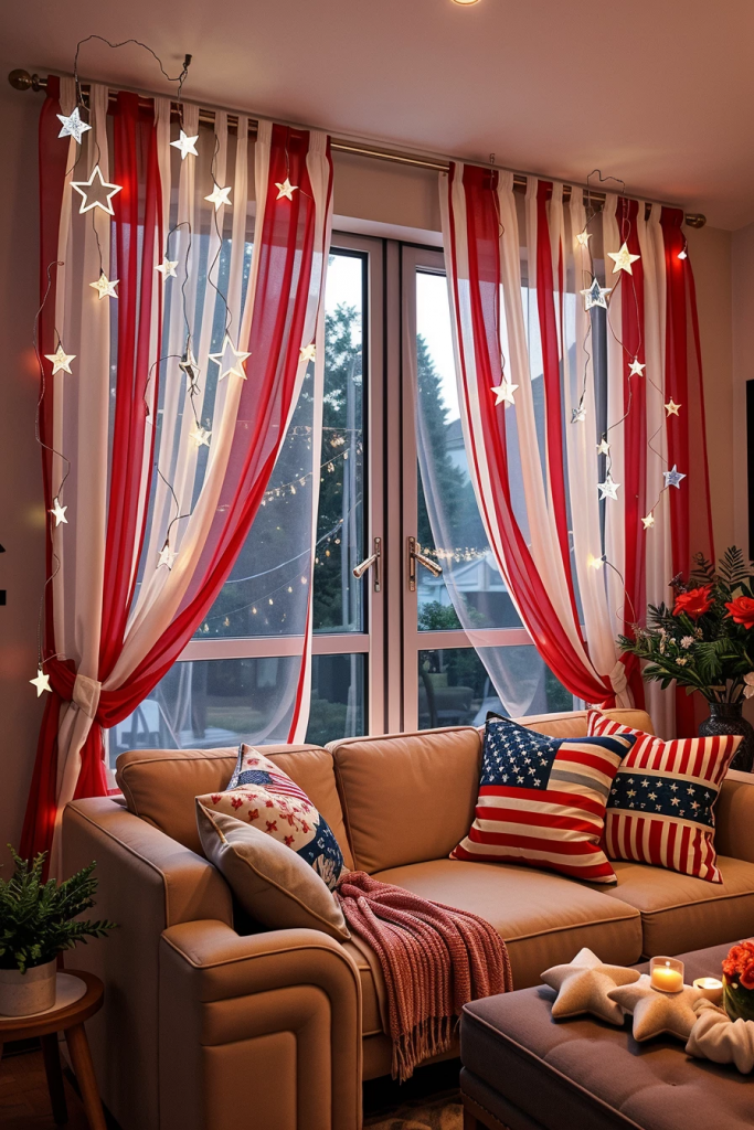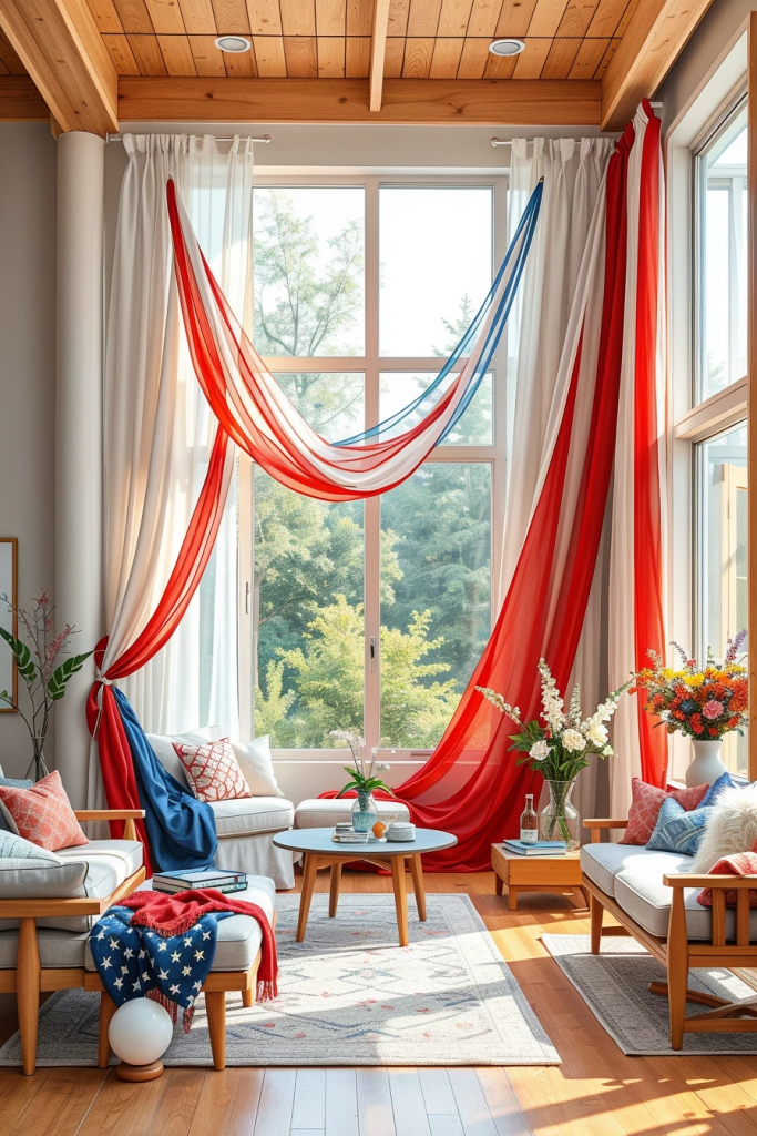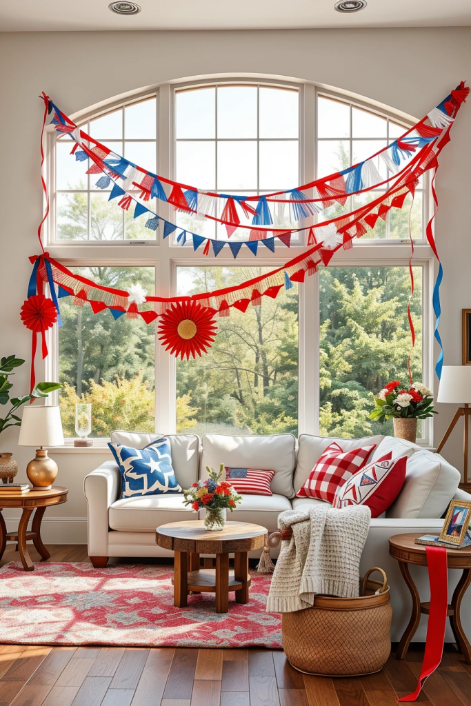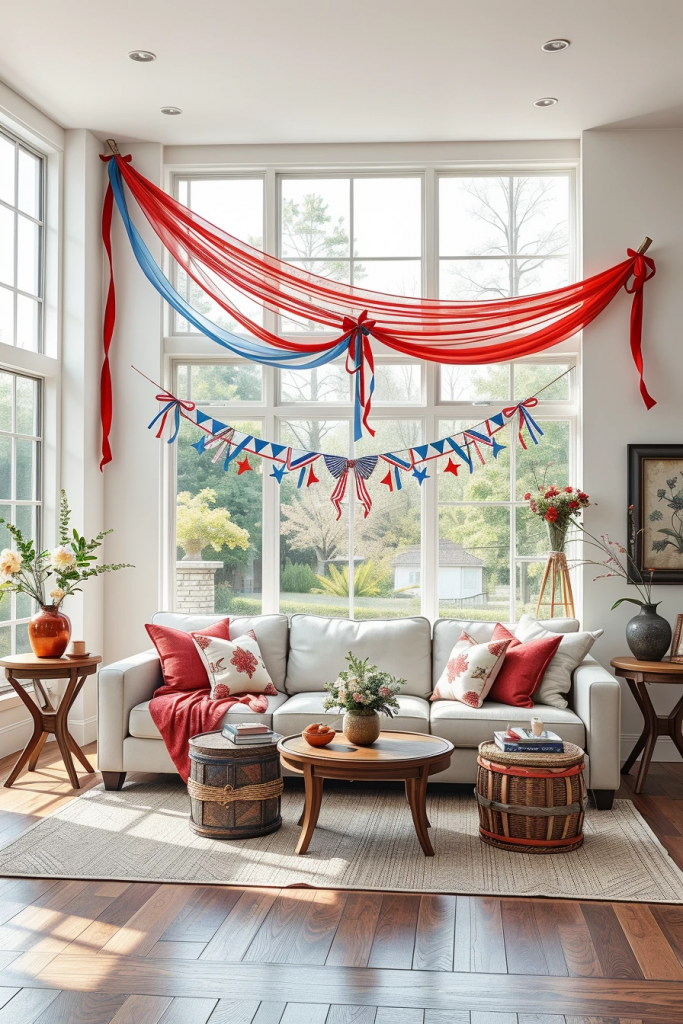 Adding patriotic streamers and ribbons to your windows brings movement and color to your 4th of July festivities. As a suggestion, red, white, and blue ribbons can additionally be hung vertically from curtains’ rods or window frames so that they sway gently in the breeze. To further enhance the focus on the energetic window decor, balance it out with understated furnishings such as side tables made from wood and a white sofa.