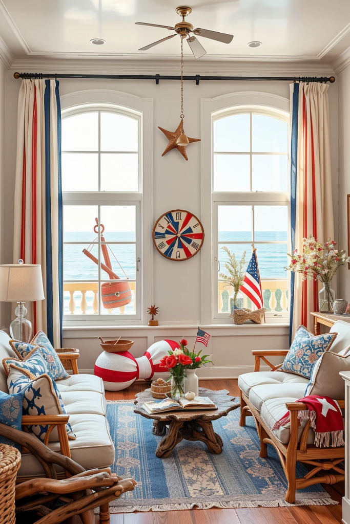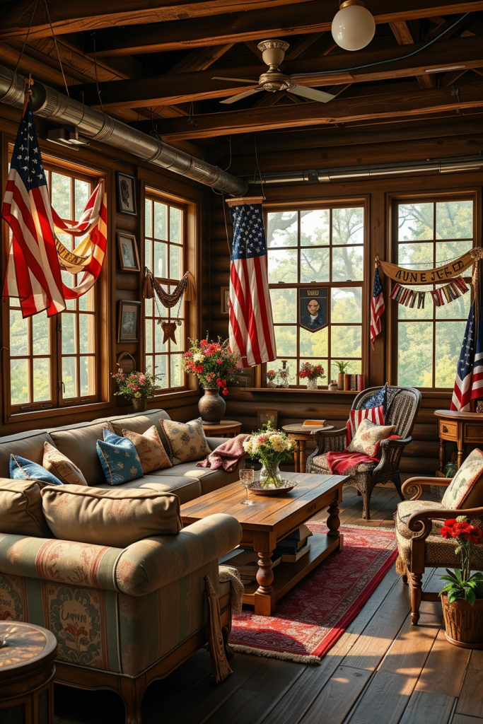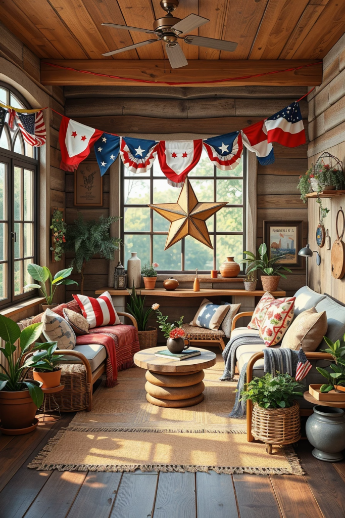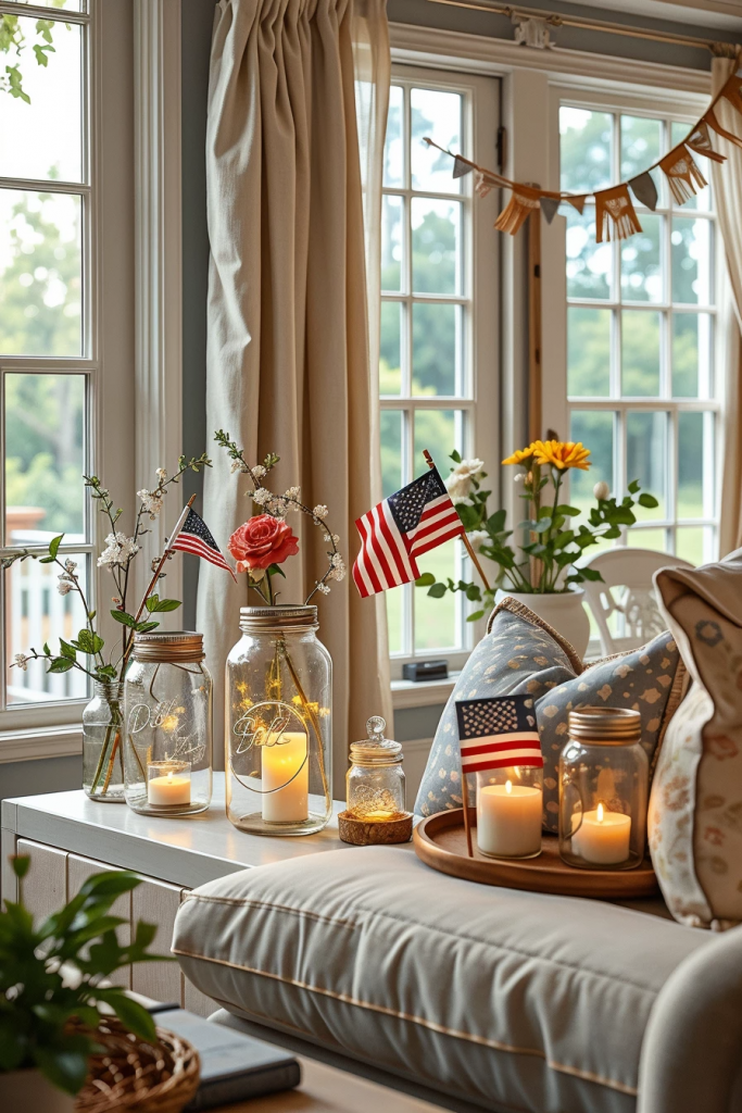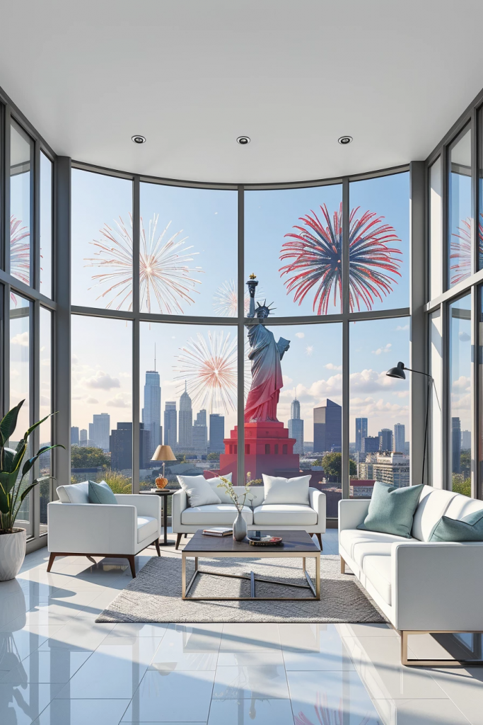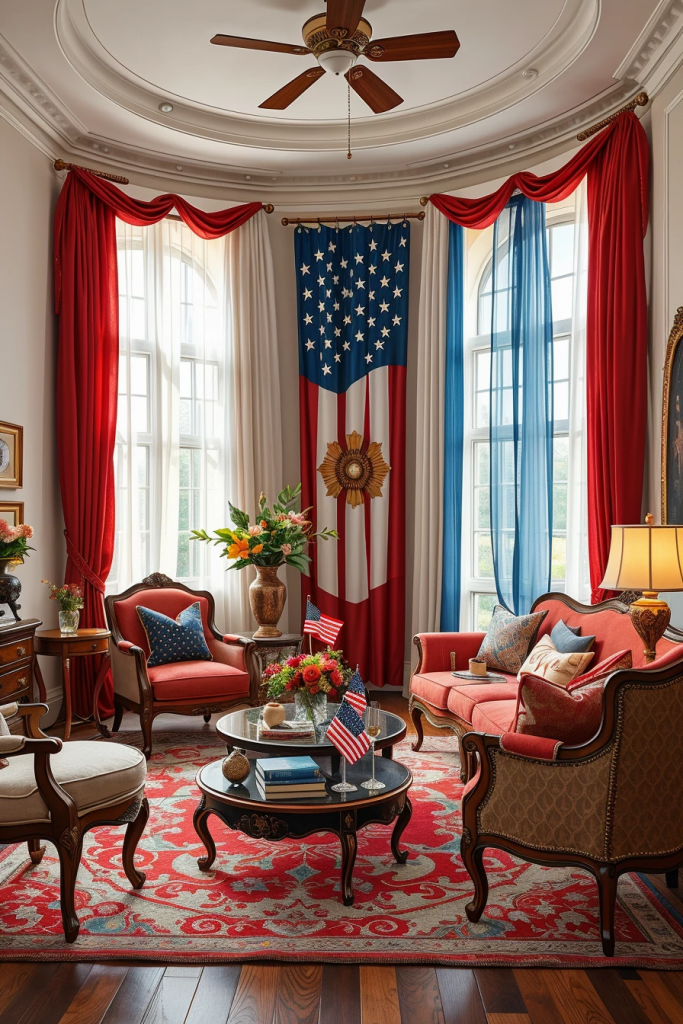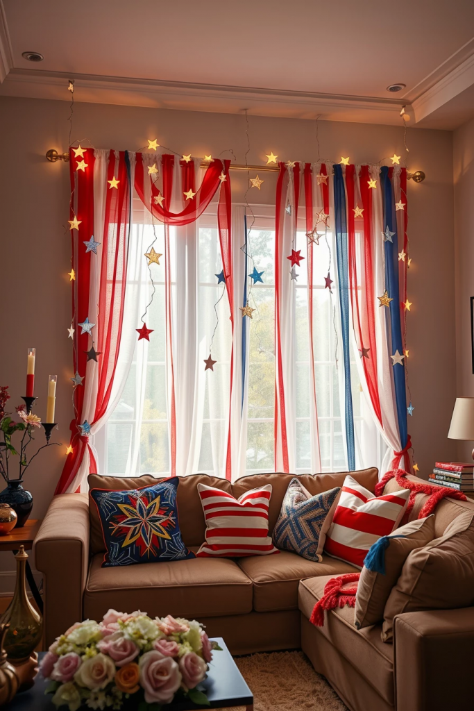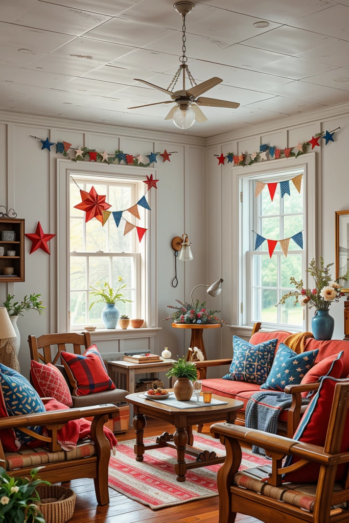 Adding patriotic streamers and ribbons to your windows brings movement and color to your 4th of July festivities. As a suggestion, red, white, and blue ribbons can additionally be hung vertically from curtains’ rods or window frames so that they sway gently in the breeze. To further enhance the focus on the energetic window decor, balance it out with understated furnishings such as side tables made from wood and a white sofa.