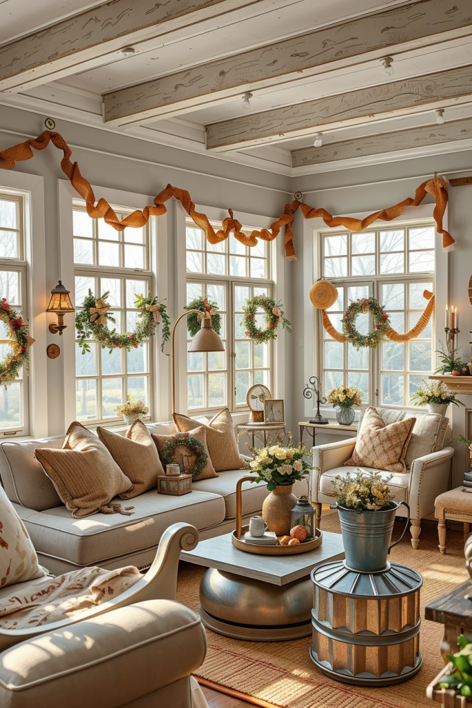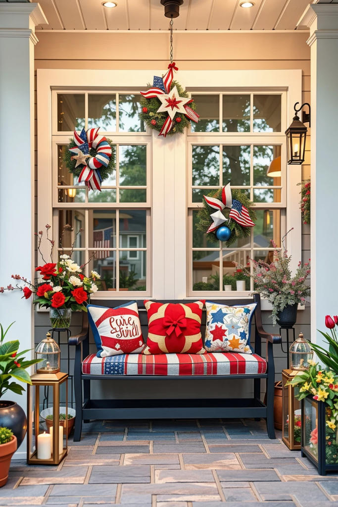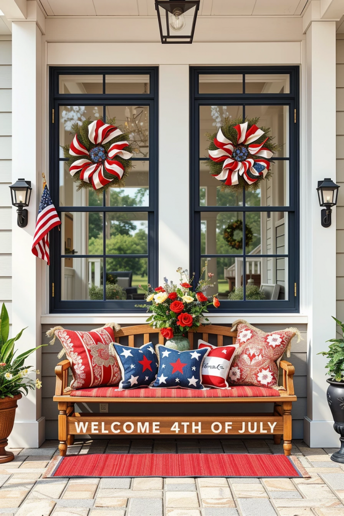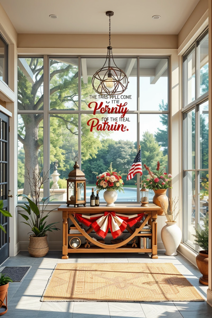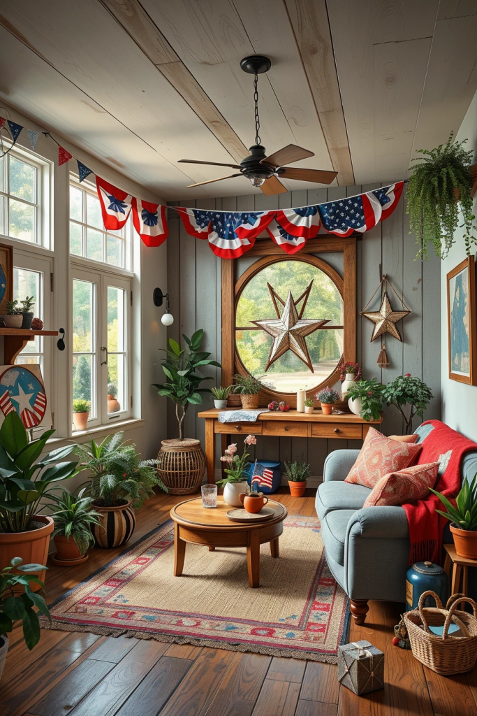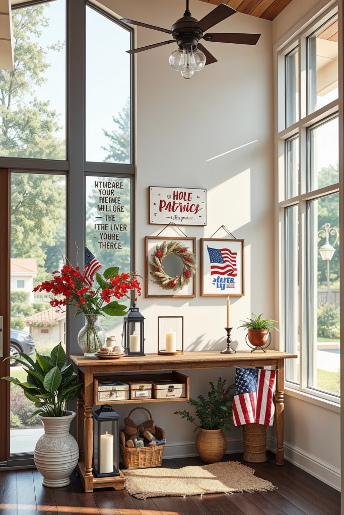 Showcase festive farmhouse window decorations that picture the spirit of the countryside celebrations. Use weathered wood frames and simple fabric banners alongside burlap garlands in muted patriotic colors. Completing the window area with whitewashed furniture and a couple of galvanized metal items provides the true rustic charm that oozes summer vibes – refreshing, homey, and stunning all at once.