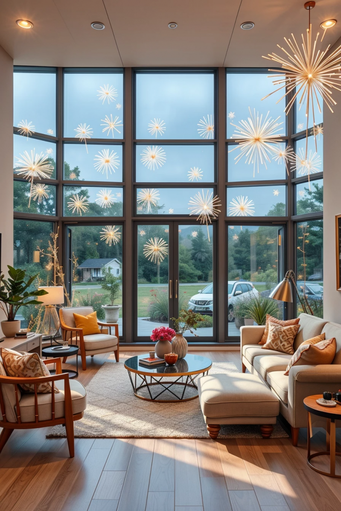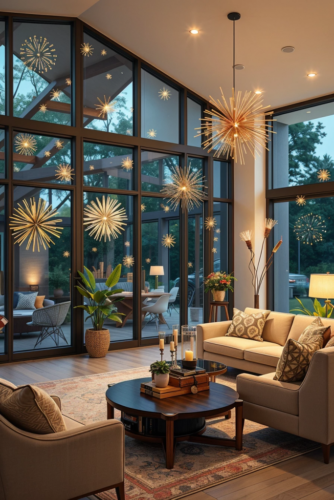 Illuminate your windows with fireworks inspired patterns that celebrate the essence of the holidays. Recreate the breathtaking beauty of fireworks on your windows using decalyne, sparkly paint, or LED lights. Ensure the rest of the room is kept simple and painted in neutral shades so that the dazzling decorations take the center stage of your festive setup.