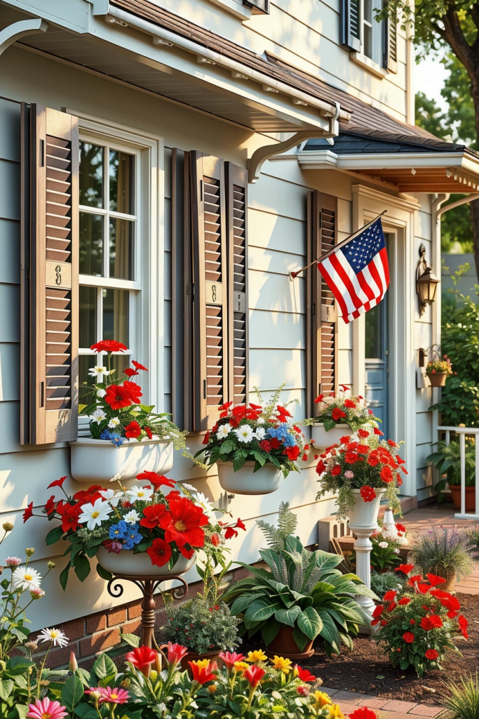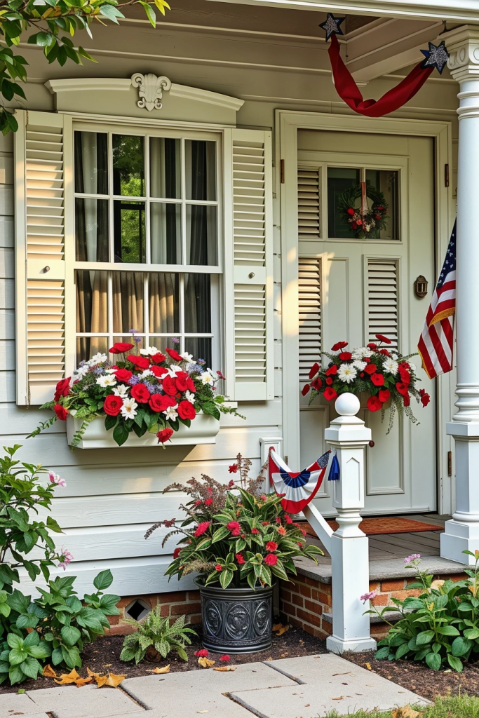 Celebrating the 4th of July comes to life with splendid red, white, and blue petunias, geraniums, and lobelias spilling from window boxes. The use of vivid colors to fill window boxes helps to cultivate a vibrant patriotic atmosphere. Adding classic shutters, an inviting front porch, and a flag bunting above the door completes the exterior look and Festive Petal brings a légèreté to the holiday scene.