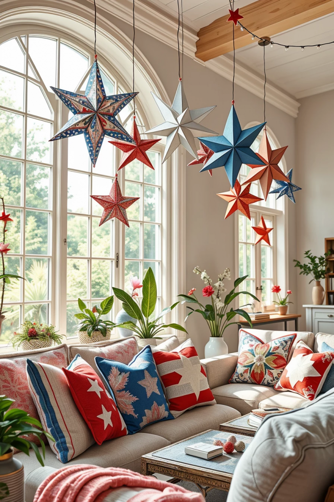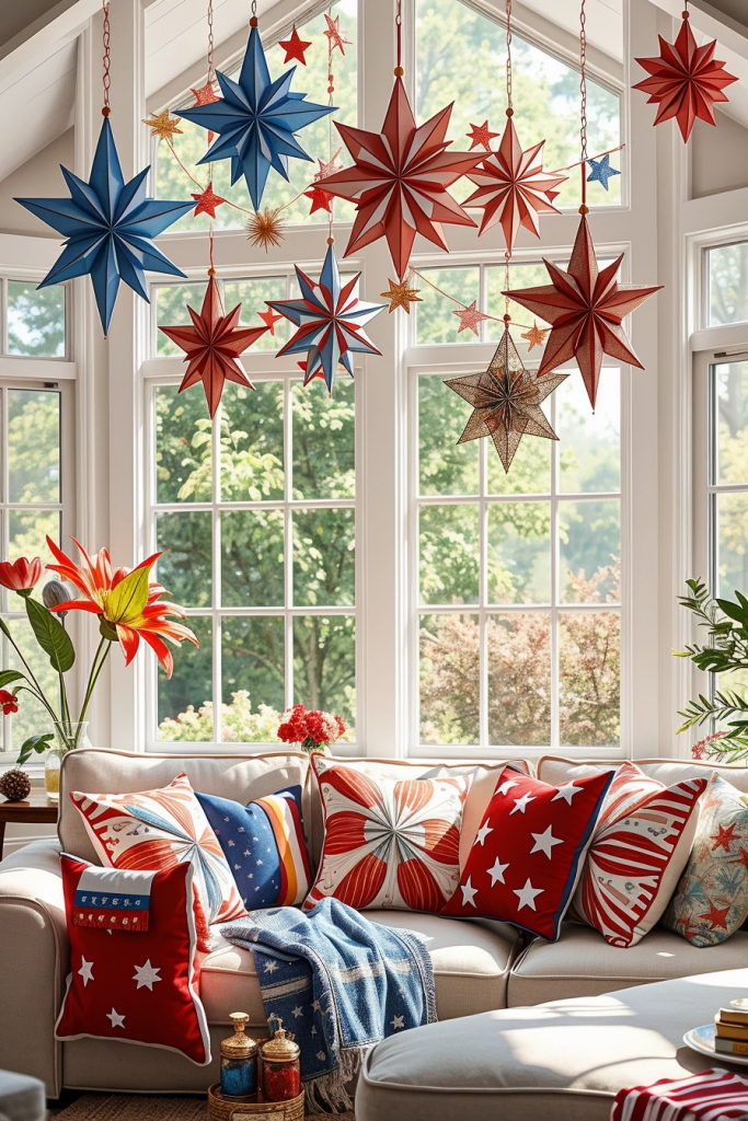 The charming, handmade paper stars can enhance your festive window decorations, celebrating your patriotism alongside the country’s flag. For a more eye-catching display, dangle the stars from the windows at different heights using shimmering or textured red, white, and blue paper. Make sure that it’s easy to sit looking at the window so that the bright throw pillows and comfortable seat can help complete the festive look alongside the more casual decorations on the table.