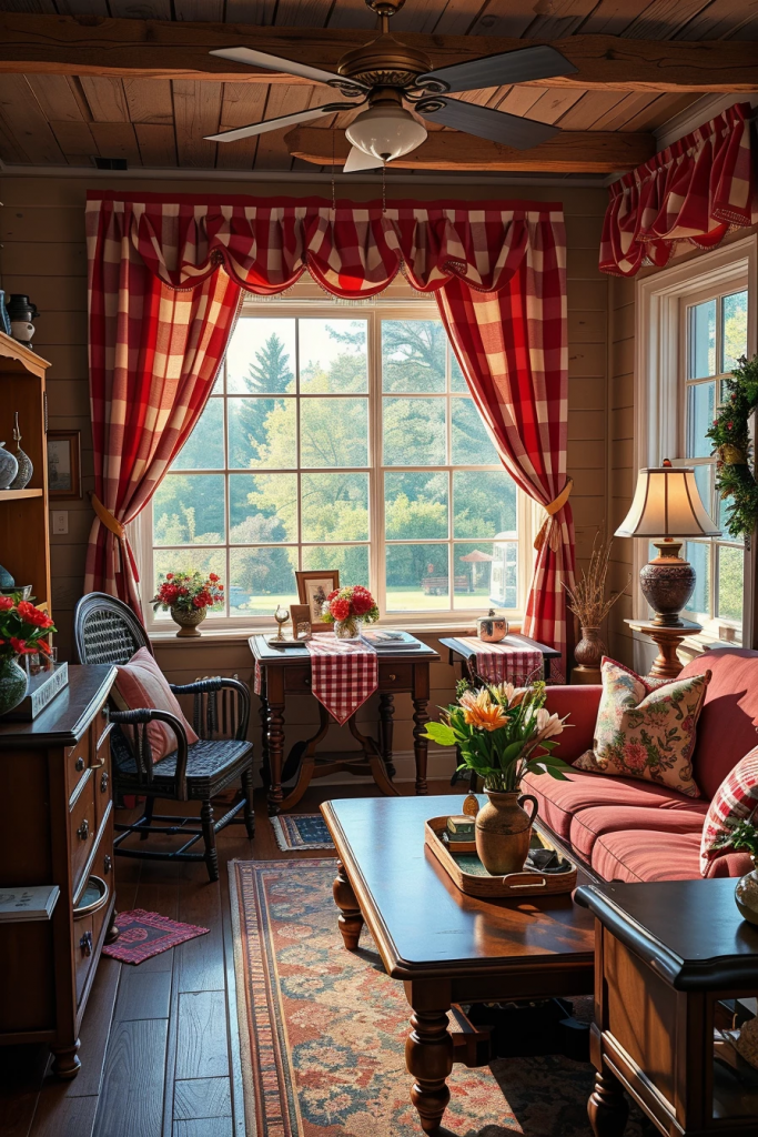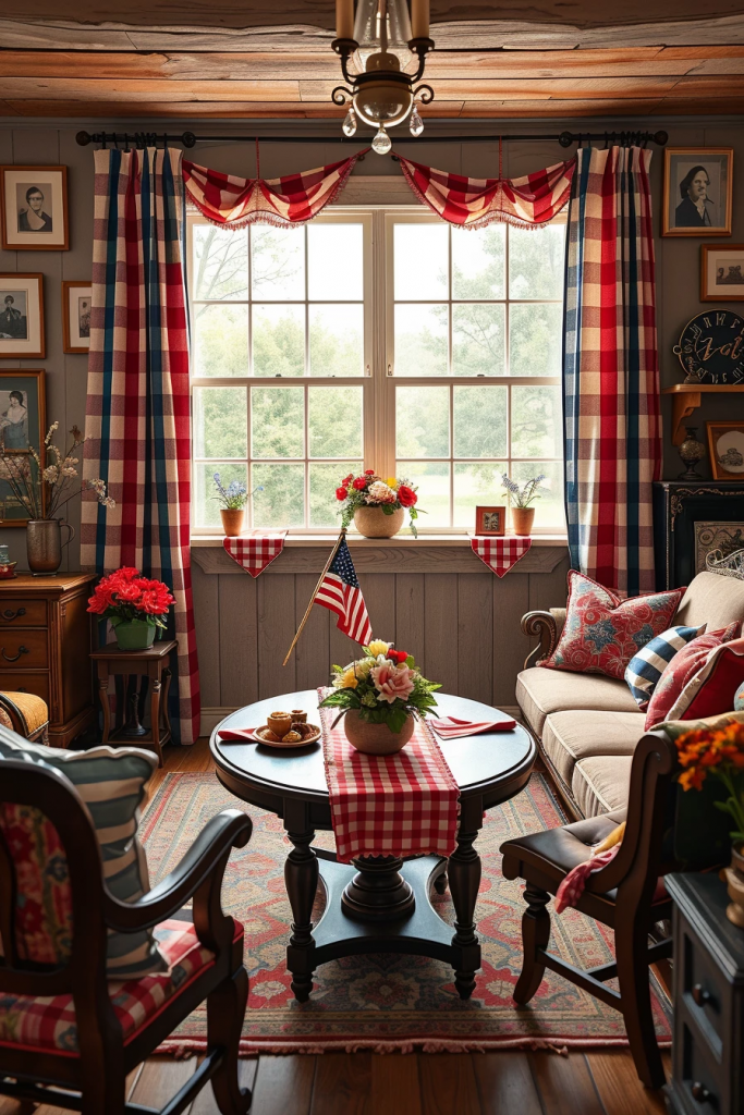Enhance the country feel of your windows with the country style window coverings by adding patriotic plaid and gingham. You can pick curtains in red, white, and blue plaid; or you can use gingham runners on the window sills. Complete the look with rustic farmhouse style furniture like a shabby wood dining table or old-fashioned chairs for a classic all-American 4th of July celebration feel.