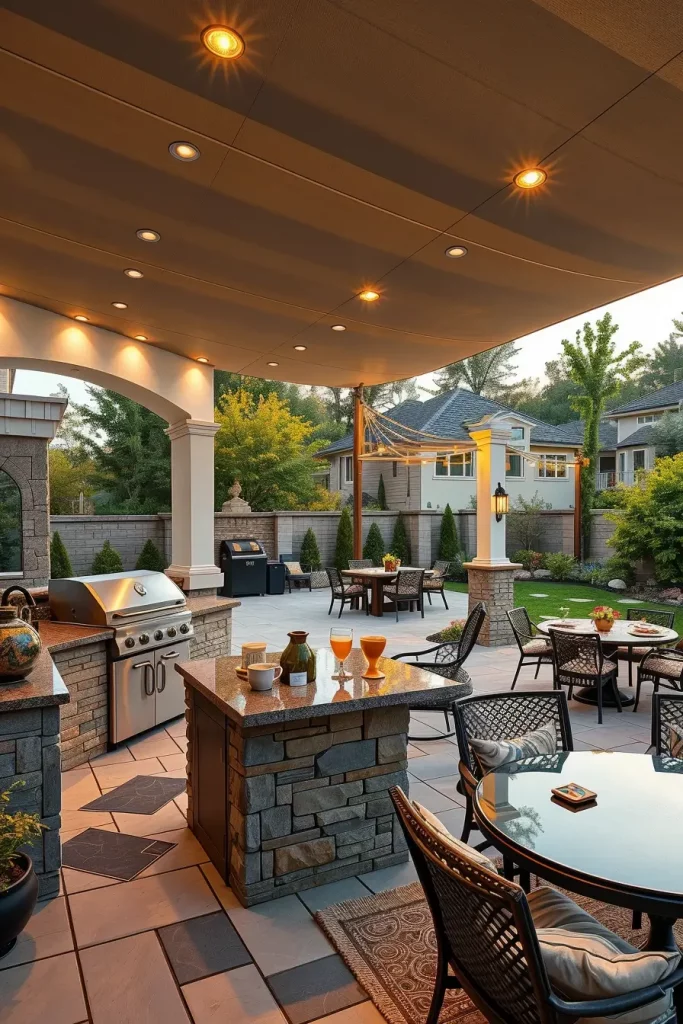 In my designs, I include built-in grills, prep counters, weather-resistant cabinetry, and dedicated dining areas. Stone or concrete countertops perform well outdoors and provide visual continuity with patios and walkways. I also prioritize proper ventilation, lighting, and shade structures to ensure the kitchen remains usable throughout different seasons and times of day.