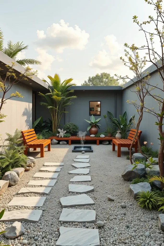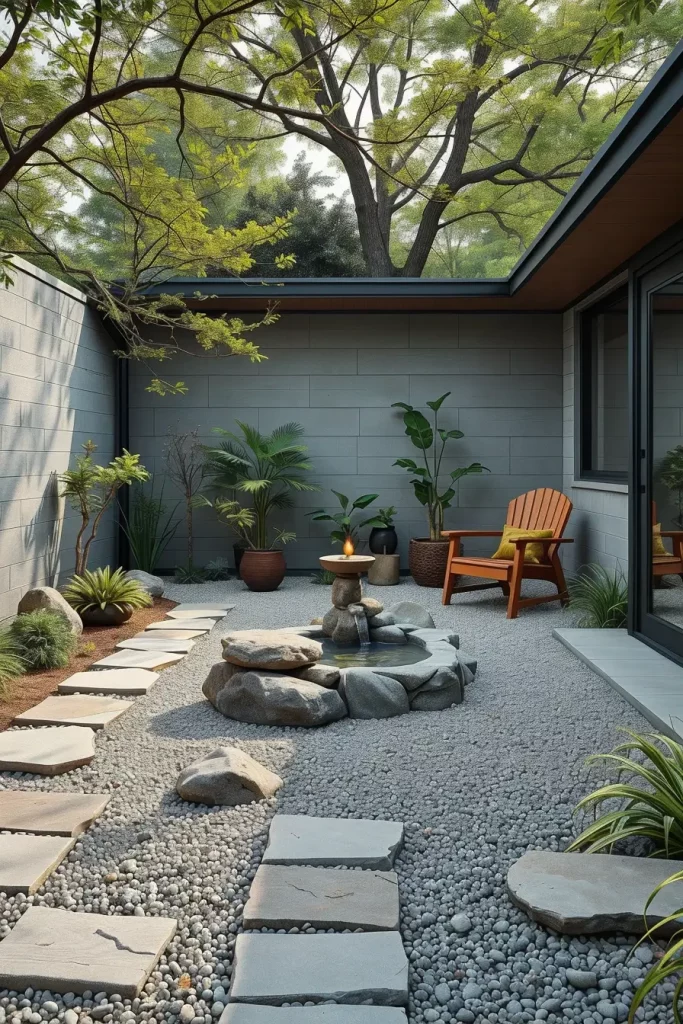I typically include stone pathways, gravel surfaces, water features with gentle movement, and minimalist seating made from wood or stone. Each element has a defined purpose, and I avoid overcrowding the space. Low-maintenance greenery such as ornamental grasses and sculptural shrubs supports the clean layout while remaining practical year-round.