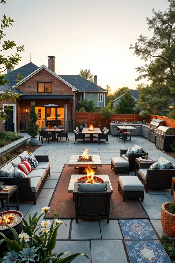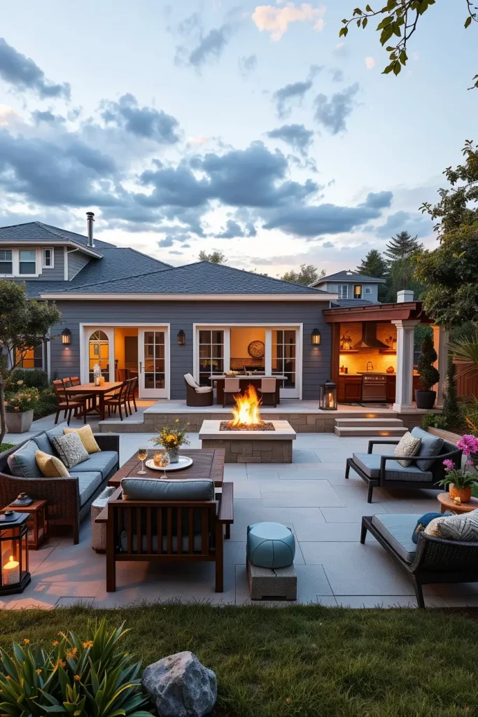 I incorporate modular outdoor seating, weather-resistant dining furniture, built-in benches, and outdoor kitchens with integrated storage. Materials are selected for durability and ease of maintenance, ensuring the backyard remains guest-ready with minimal effort. Fire features and lighting help anchor gathering zones and extend usability into the evening.