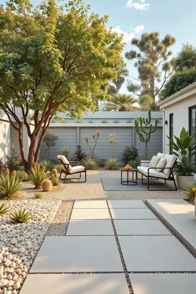 I include native plants, permeable paving, gravel beds, and efficient irrigation systems such as drip lines. Furniture and hardscape elements become more prominent in these designs, providing structure and comfort without relying heavily on lush planting. Shade placement also plays a critical role in protecting plantings and improving usability.