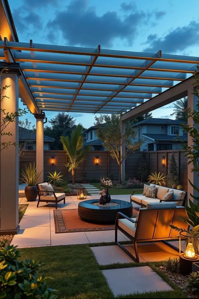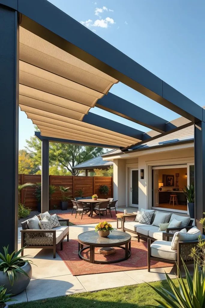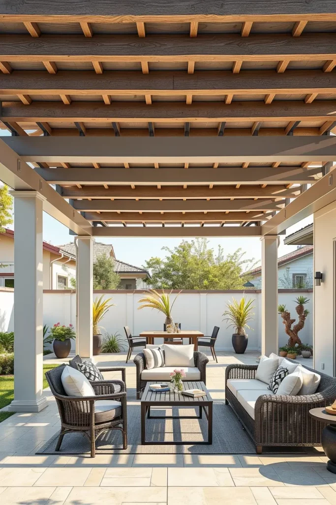 I typically specify modern pergolas with clean lines, adjustable louvers, or integrated fabric canopies. Beneath them, I place lounge seating, dining tables, or outdoor sofas to encourage extended use. Materials like aluminum, treated wood, and composite finishes ensure longevity and visual consistency with contemporary homes.