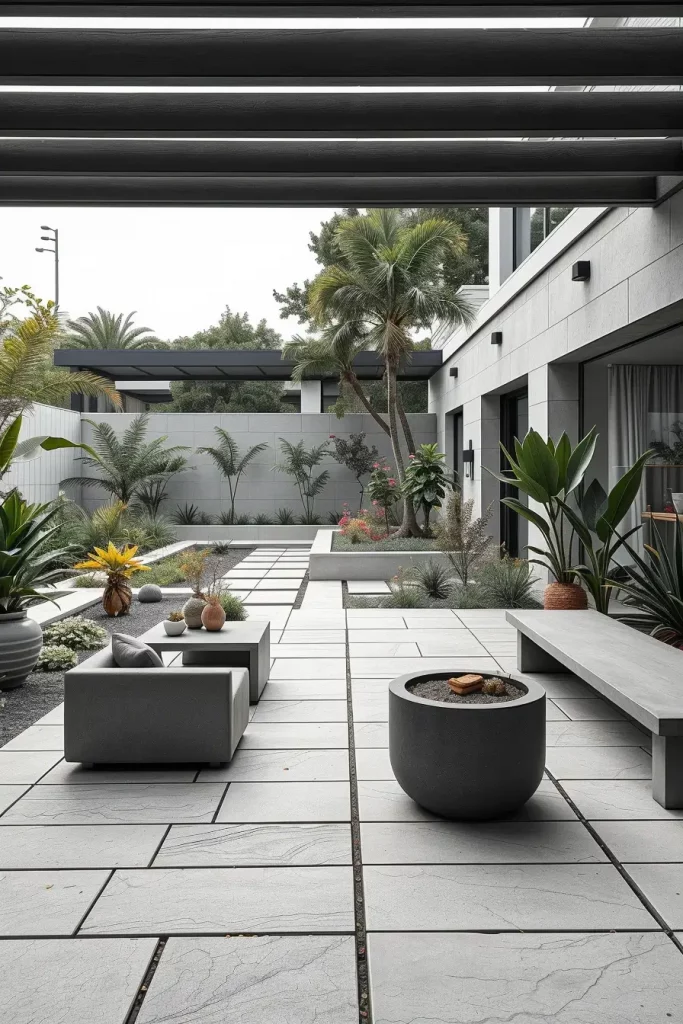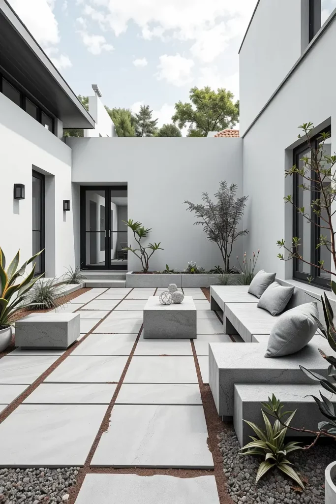 Furniture selections are intentional and minimal, often including modular seating, concrete or stone tables, and integrated benches. Hardscaping features such as linear paving, reflecting pools, and monochrome fencing define the space without overwhelming it. Plant choices are limited to sculptural forms like ornamental grasses and small trees.