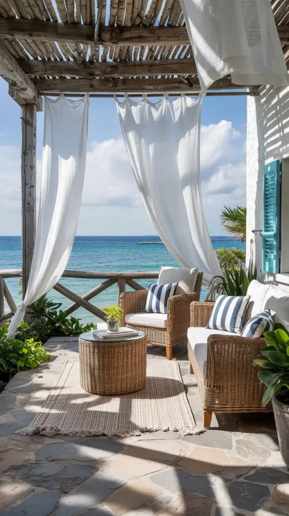 What I would add here is movement, such as lightweight curtains or plants that sway in the breeze. This adds a dynamic quality that enhances the overall coastal feel.