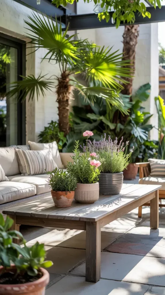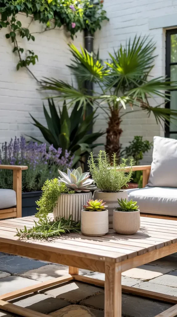 I usually combine potted palms, lavender, succulents, and climbing plants. Large planters help anchor the design, while smaller pots add layers and detail. I recommend using ceramic or textured planters to complement the overall aesthetic. Herbs like rosemary and mint are also practical additions, combining decor with functionality.