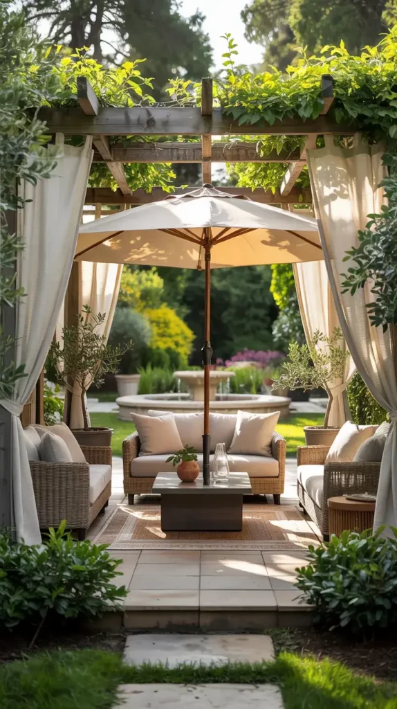 I often use pergolas, retractable awnings, or large outdoor umbrellas. Fabric canopies in neutral or earthy tones are particularly popular this year. I also recommend layering shade elements, such as combining a pergola with flowing curtains for added softness.