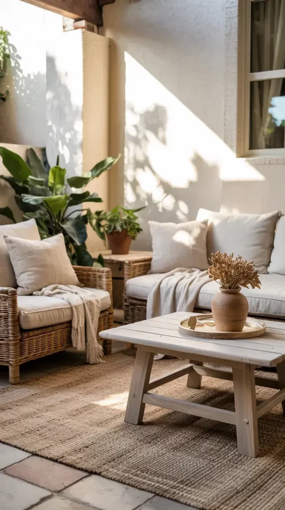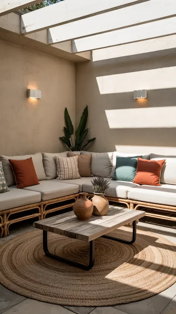 I usually combine soft textiles like cushions and throws with harder materials such as wood, stone, or metal. Woven rugs, rattan furniture, and ceramic decor pieces work particularly well together. This layering effect creates a tactile experience that makes the space feel more like an indoor living area.