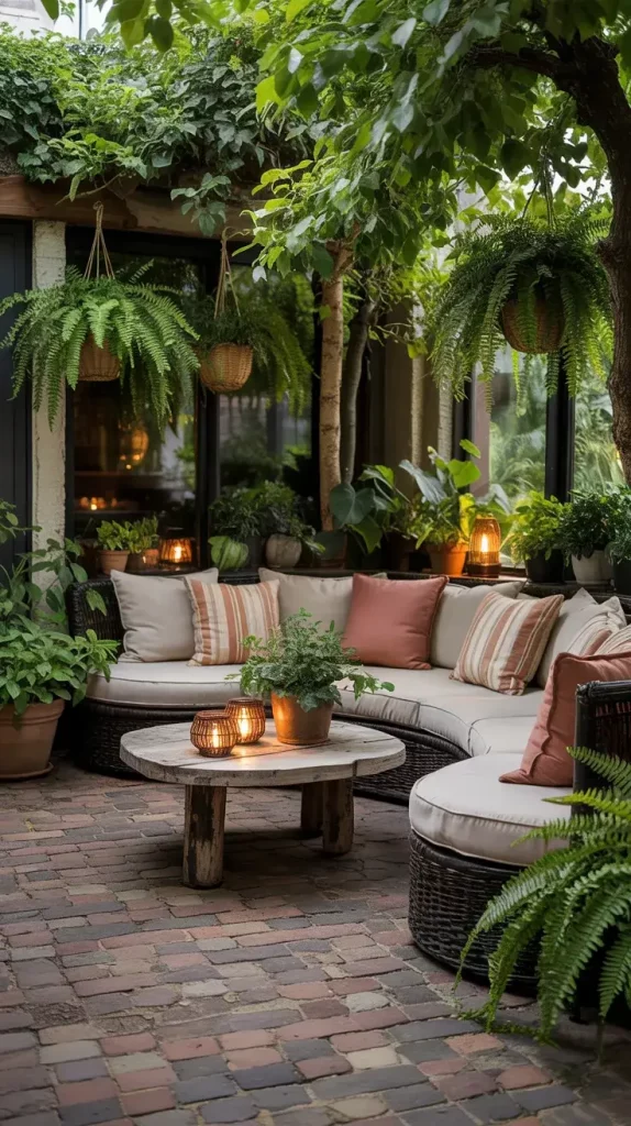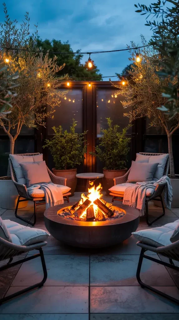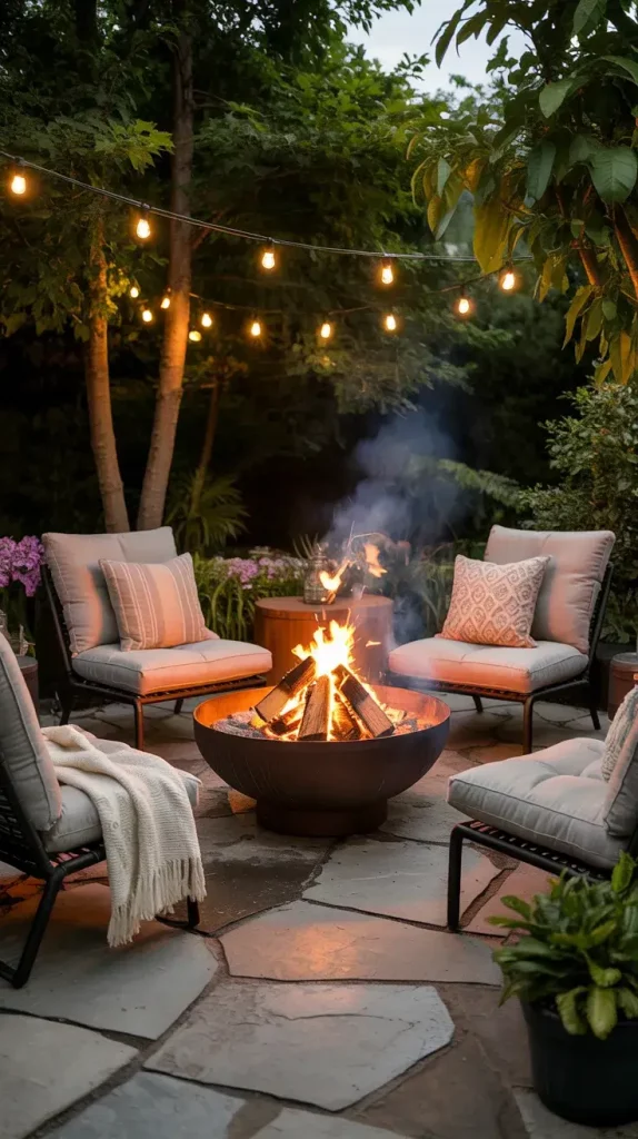 A cozy corner is a must-have in summer patio decor inspiration 2026, and I often design this space around a fire pit to create a natural gathering area. It becomes the heart of the patio, especially during cooler summer evenings, offering both warmth and ambiance.