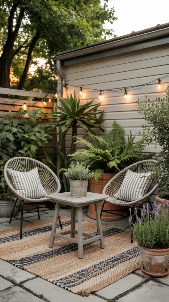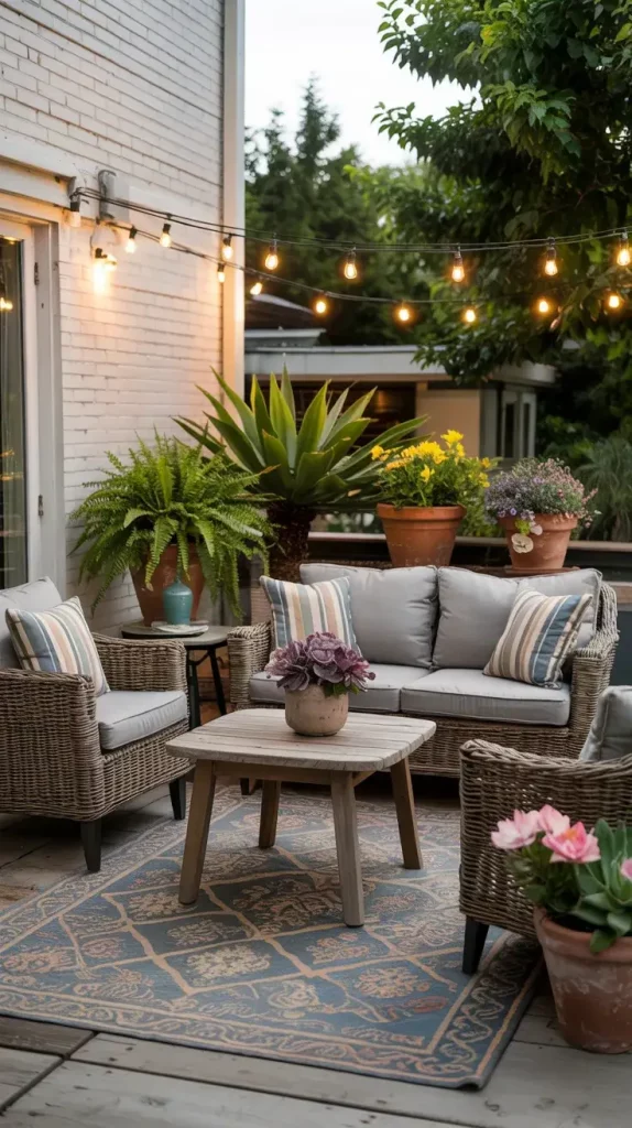 What I would add here is a stronger focus on color coordination. Even with DIY elements, maintaining a consistent palette ensures the patio looks cohesive rather than chaotic.