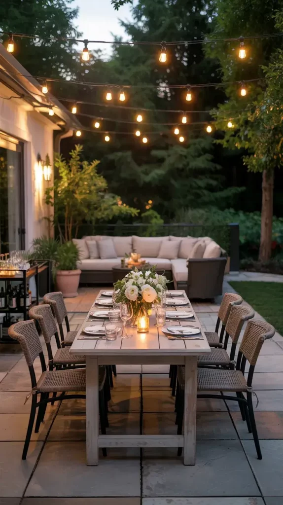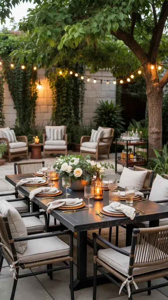 I usually include a large dining table, comfortable seating, and accent lighting such as string lights or lanterns. A bar cart or outdoor kitchen setup adds convenience and enhances the hosting experience. Decorative elements like table centerpieces, coordinated dinnerware, and layered textiles elevate the overall presentation.