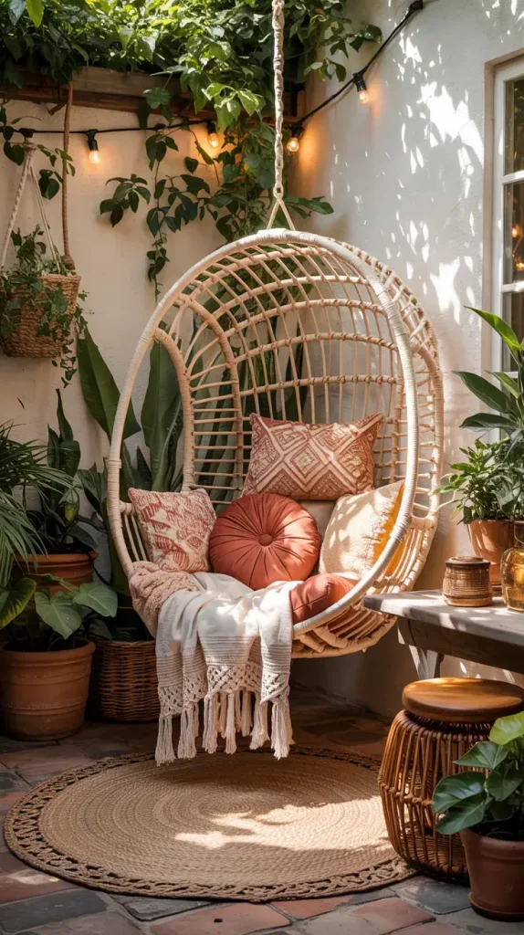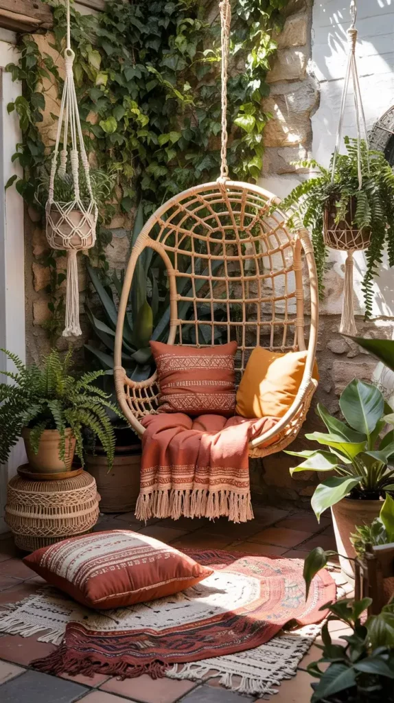 I typically include elements such as macramé decor, layered textiles, patterned cushions, and natural materials like rattan and wood. Hanging chairs or hammocks can add both functionality and visual interest. Plants also play a key role, especially when arranged in varied pots and heights.