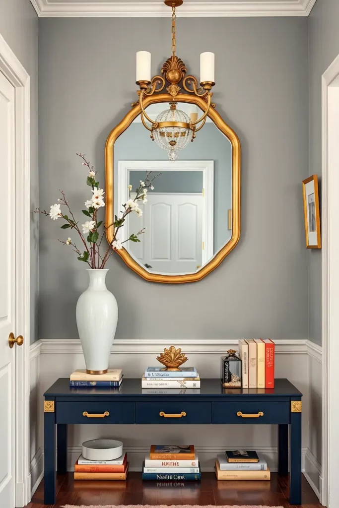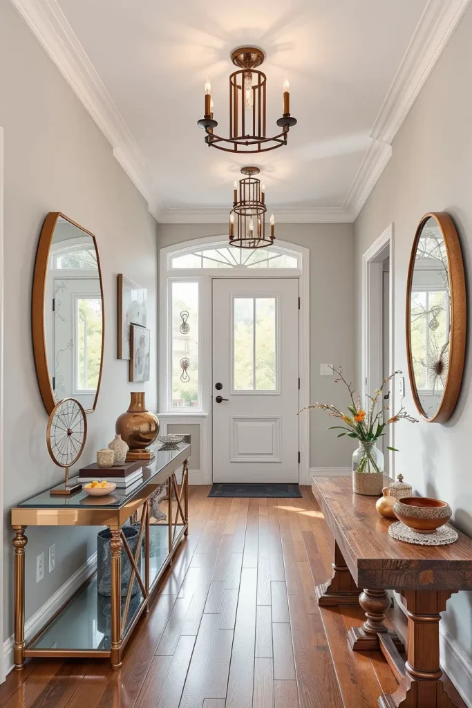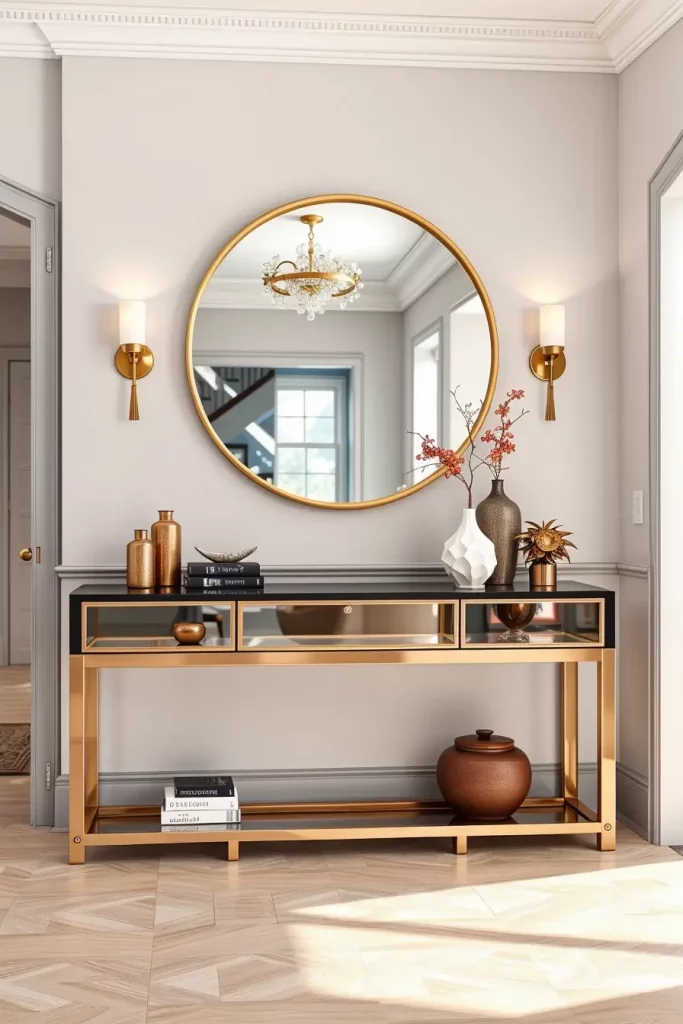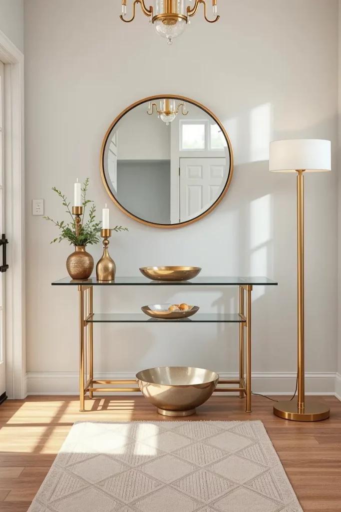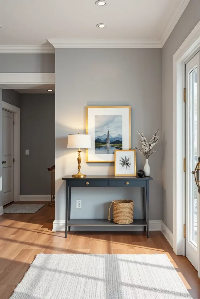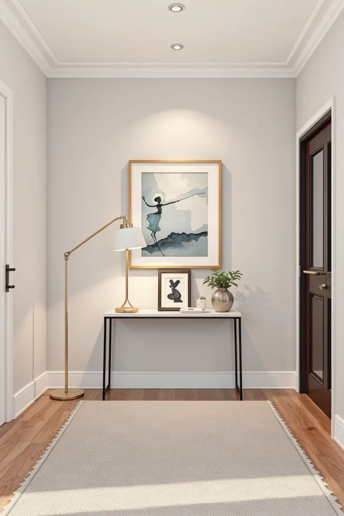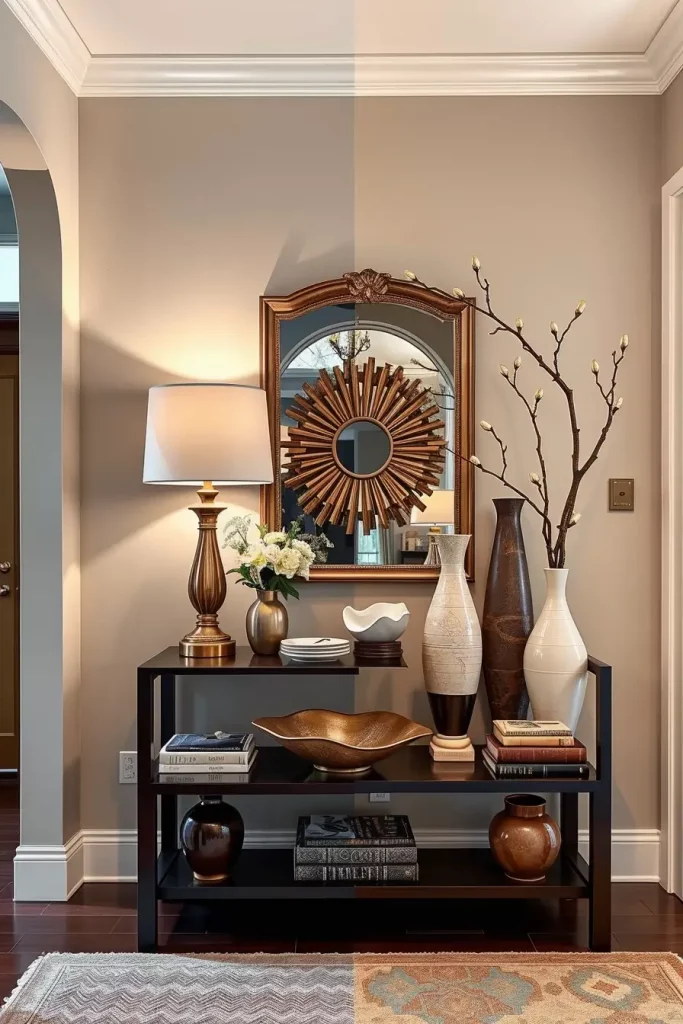 Using metallic touches has always done the work when attempting to achieve an sophisticated look for the entrance area. The combination of soft greys with gold or silver undertones definitely adds a curated aesthetic without being overwhelming. This particular style works beautifully for homes with modern, minimalist, or even transitional interior styles. I’ve especially noticed this working in narrow or open-concept foyers where all elements are arranged with an intention.