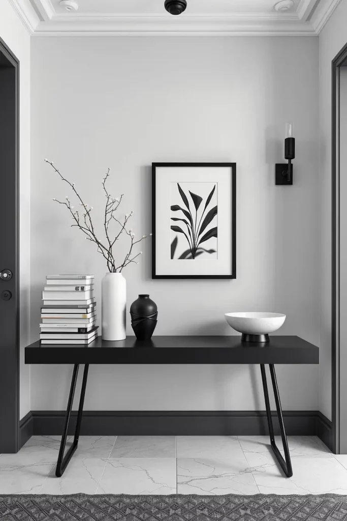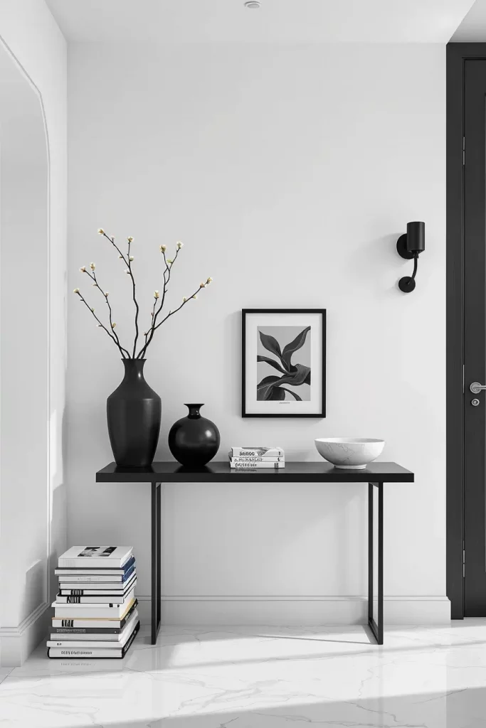 I’ve styled many such entryways, and what always strikes me is how timeless the result feels. As noted by Elle Decor, the black and white combo “bridges elegance and modernism with effortlessness.” Personally, it feels strikingly timeless and adds symmetry with pieces on boths.