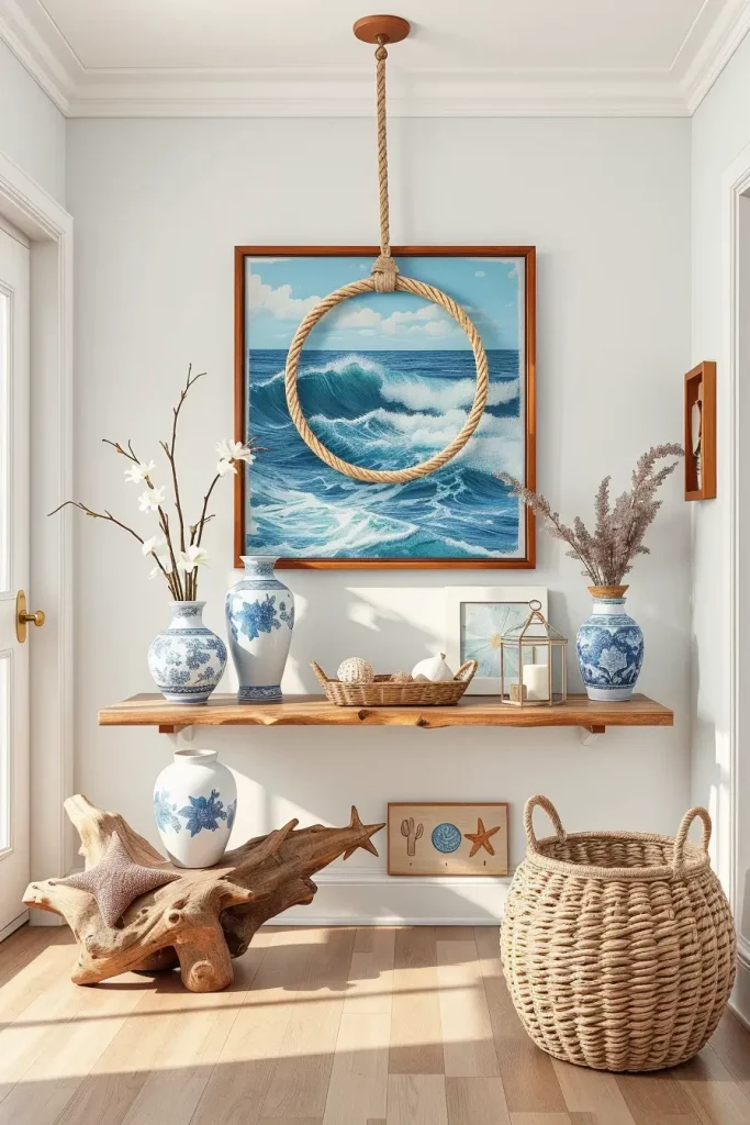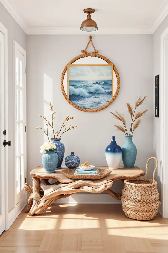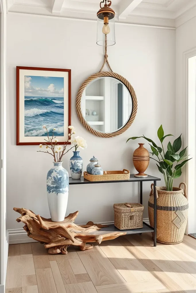 My starting point includes a driftwood styled or whitewashed entry table. I place underneath a woven basket which acts as both storage and decor. Adding a rattan tray, a few ceramic vases in ocean blues and whites, and artwork of the coastline ensures a complete look. If there’s enough space, I’ll also place a table lamp modeled after a lighthouse or lean a round mirror with a rope frame against the wall.