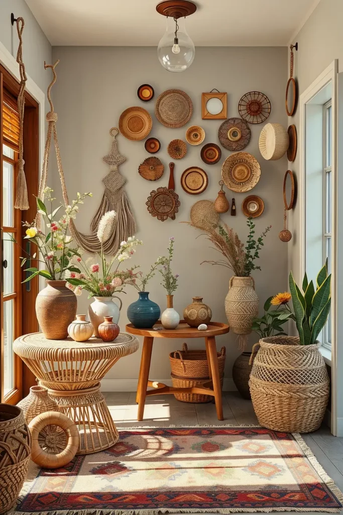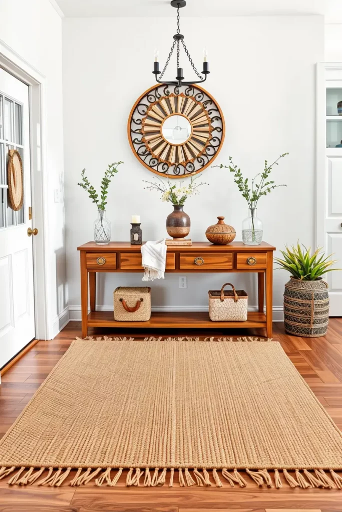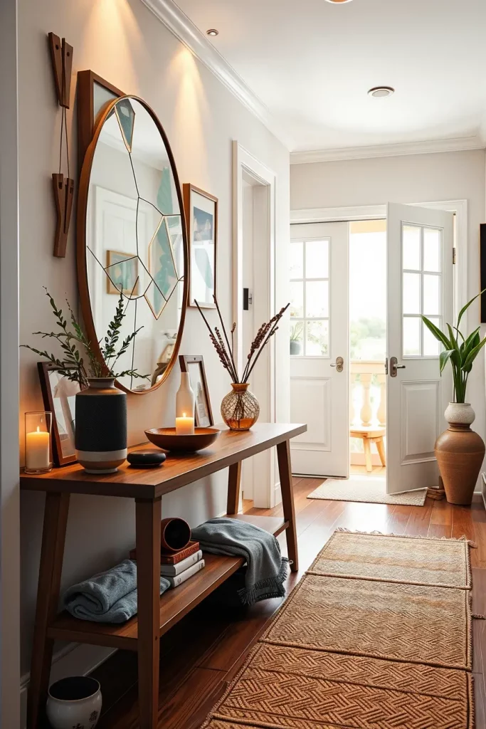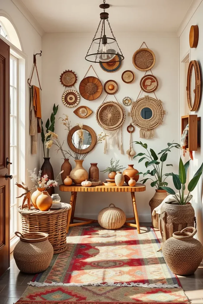 Boho entryway decor allows for individual style while accenting the natural world, which is great for creating a calm and inviting setting. I prefer using warm, earthy tones with bold artisanal pieces that boast layered textures and have an added depth, devoid of any sense of striving to meet a certain aesthetic. The intention here is to achieve coherence and balance rather than flawless execution.