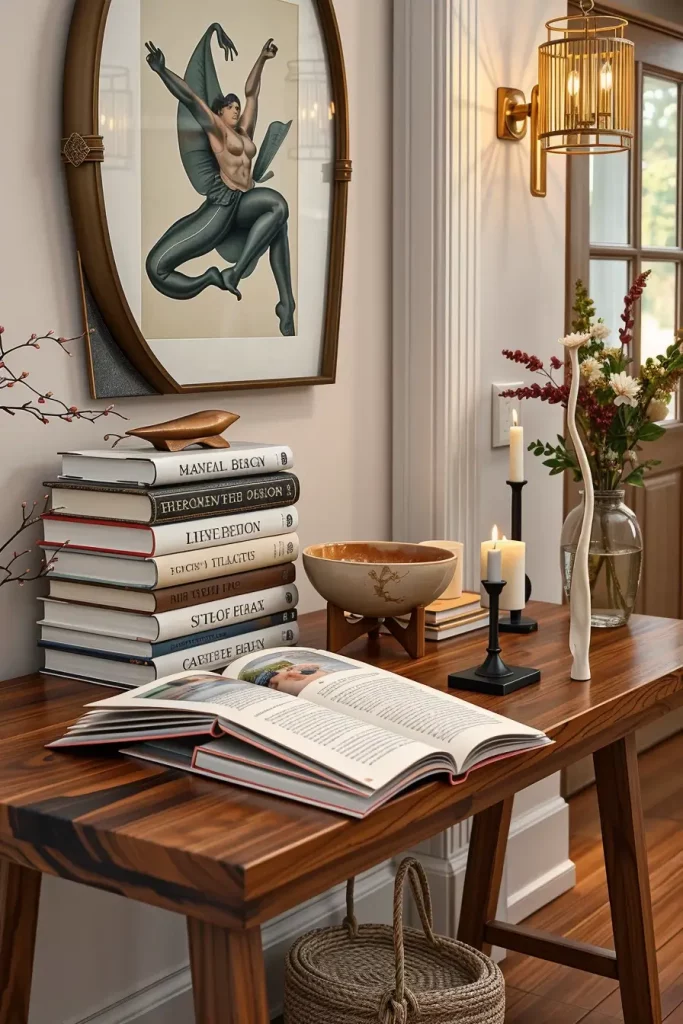 To achieve this look, select two to three hardcover books for the bottom stack. They should have spines that are known to be appealing. On top place a bowl, ceramic figurine or modest scented candle to complete the look. Alternatively, you can place an open book with decorated pages facing up.