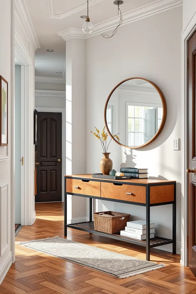For small or narrow hallways, a console table is the option that I always go with. These wall mounted surfaces don’t take up any foot space and instantly improve the airiness of an even cramped hallway. For this spot, I go with Scandinavian or minimalist styles—natural wood, matte black or soft white shelves are less obtrusive and add depth to the space.